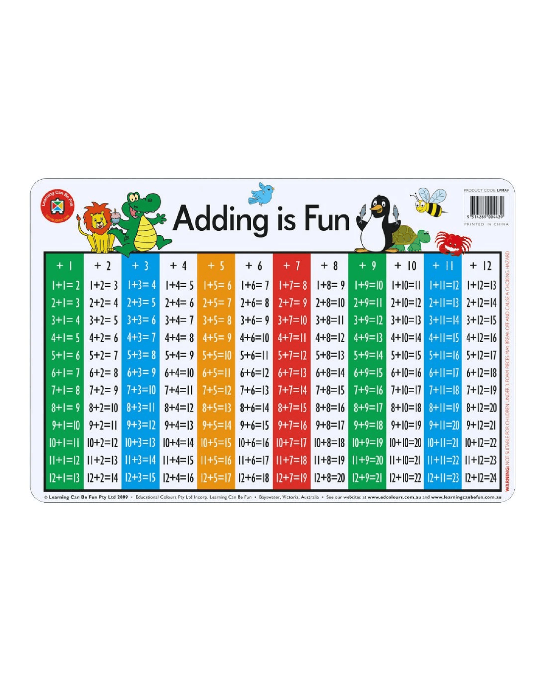 This Learning Can Be Fun Placemat features a bright addition table making meal times more educational. The placemat is made from premium vinyl material which is easy to wipe clean after use. It's printed using non-toxic ink making it a great option for the whole family.