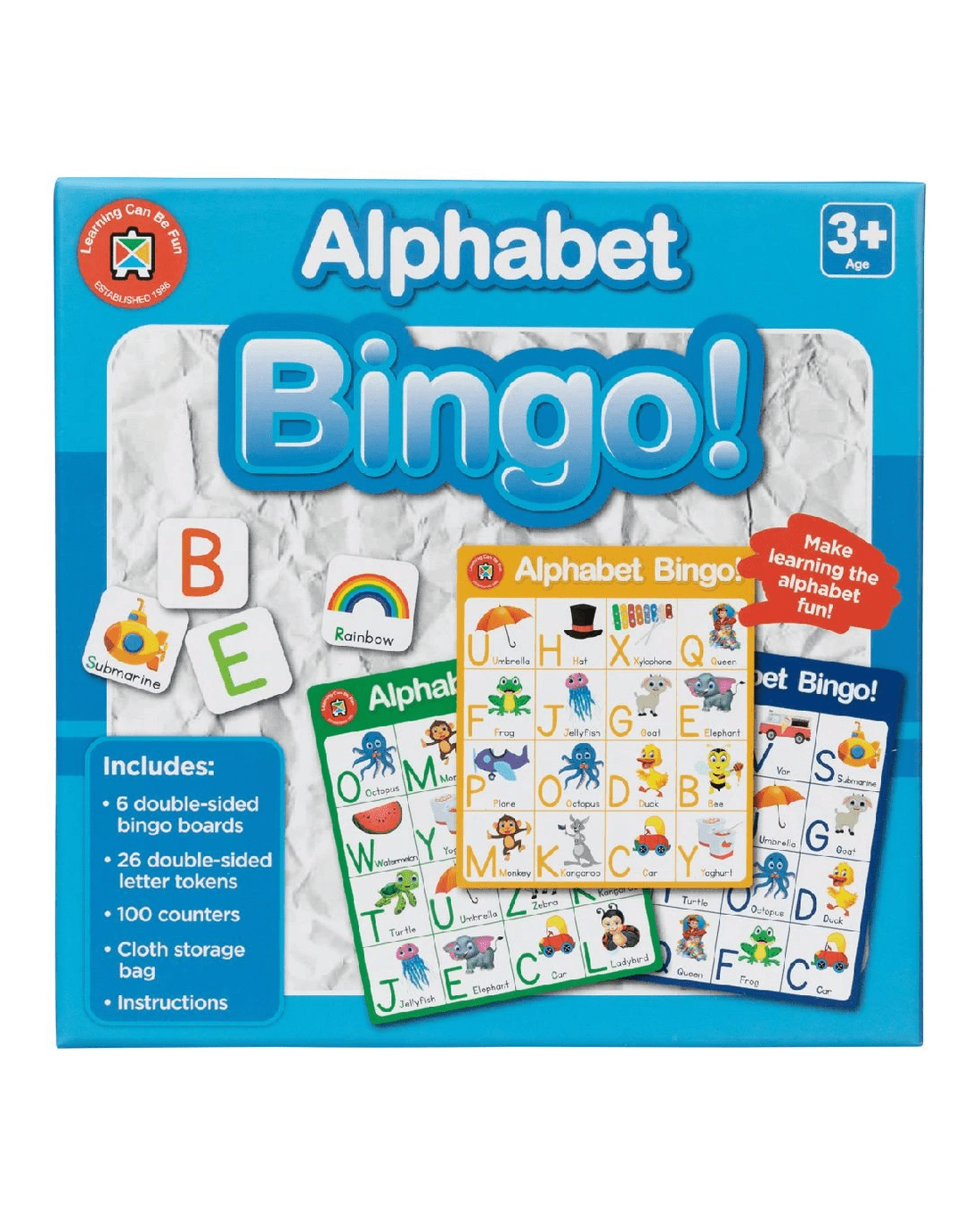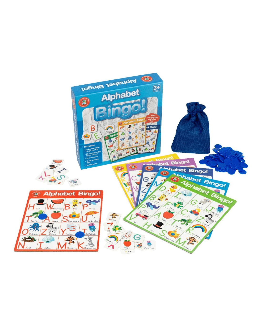 Alphabet Bingo is a fun and engaging way of helping young ones learn their ABCs. This game will help improve the player's letter and word recognition, giving them the skills and experience they need as they learn how to read. This set includes everything you'll need to play including 6 double-sided bingo boards, 21 double-sided sound tokens, 100 counters and instructions, plus, a cloth storage bag to keep it all together.