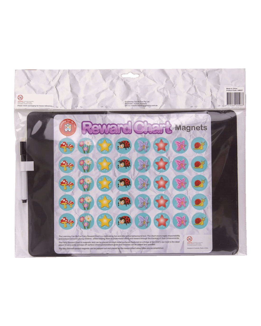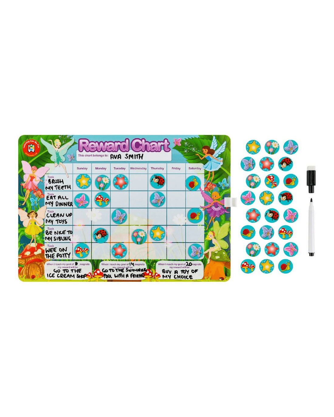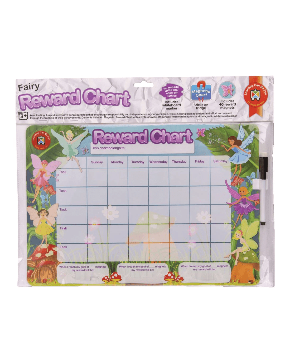 This Learning Can Be Fun Reward Chart is a great tool for encouraging good work and behaviour from early learners. The chart has a magnetic dry erase surface so you can write on it or add the praise magnets to mark off tasks, plus it features a spot where you can add personalised tasks and goals.