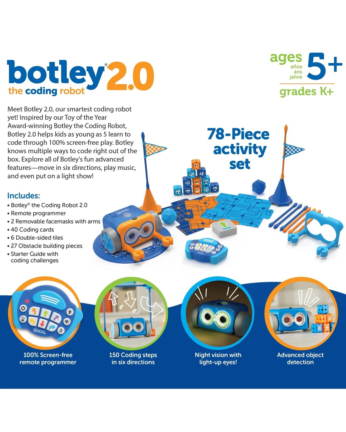 Meet Botley 2.0 The Coding Robot, our smartest coding robot yet! The next generation of our Toy of the Year winner Botley the Coding Robot, Botley 2.0 helps kids as young as 5 learn to code through 100% screen-free play. Botley 2.0 knows multiple ways to code right out of the box, code by color, make Botley move in six directions, and even put on a light show! Discover Botley 2.0' s 16 fun interactions, transform Botley into a train, police car, ghost, and more! You can even test your memory with the lights and sounds of a game of Botley Says! Your little coders can build coding sequences of up to 150 steps, and go on adventures with a built-in sensor that lights up Botley 2.0 in the dark! With the help of Botley' s 78-piece activity set, kids will be solving their first coding and STEM challenges in just minutes! Ages 5 +