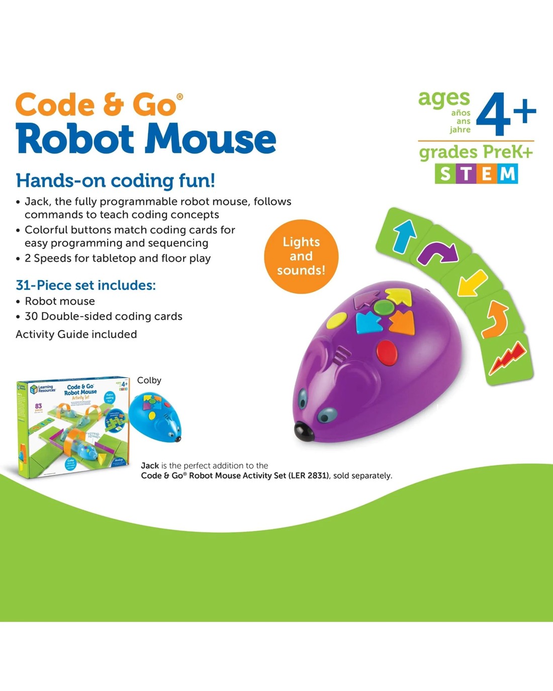 Jack the fully programmable robot mouse is designed to introduce children to the world of coding through hands-on play. With 30 double-sided coding cards, kids can create step-by-step paths for Jack to follow, learning sequencing, problem-solving, and basic programming skills along the way. Jack's colorful buttons, lights, and sounds make coding fun and accessible. Featuring two speeds and an easy-to-use interface, Jack offers endless learning opportunities and is compatible with the STEM Robot Mouse Coding Activity Set for expanded adventures.Jack measures 4"L and requires 3 AAA batteries (not included). Ages: 4+