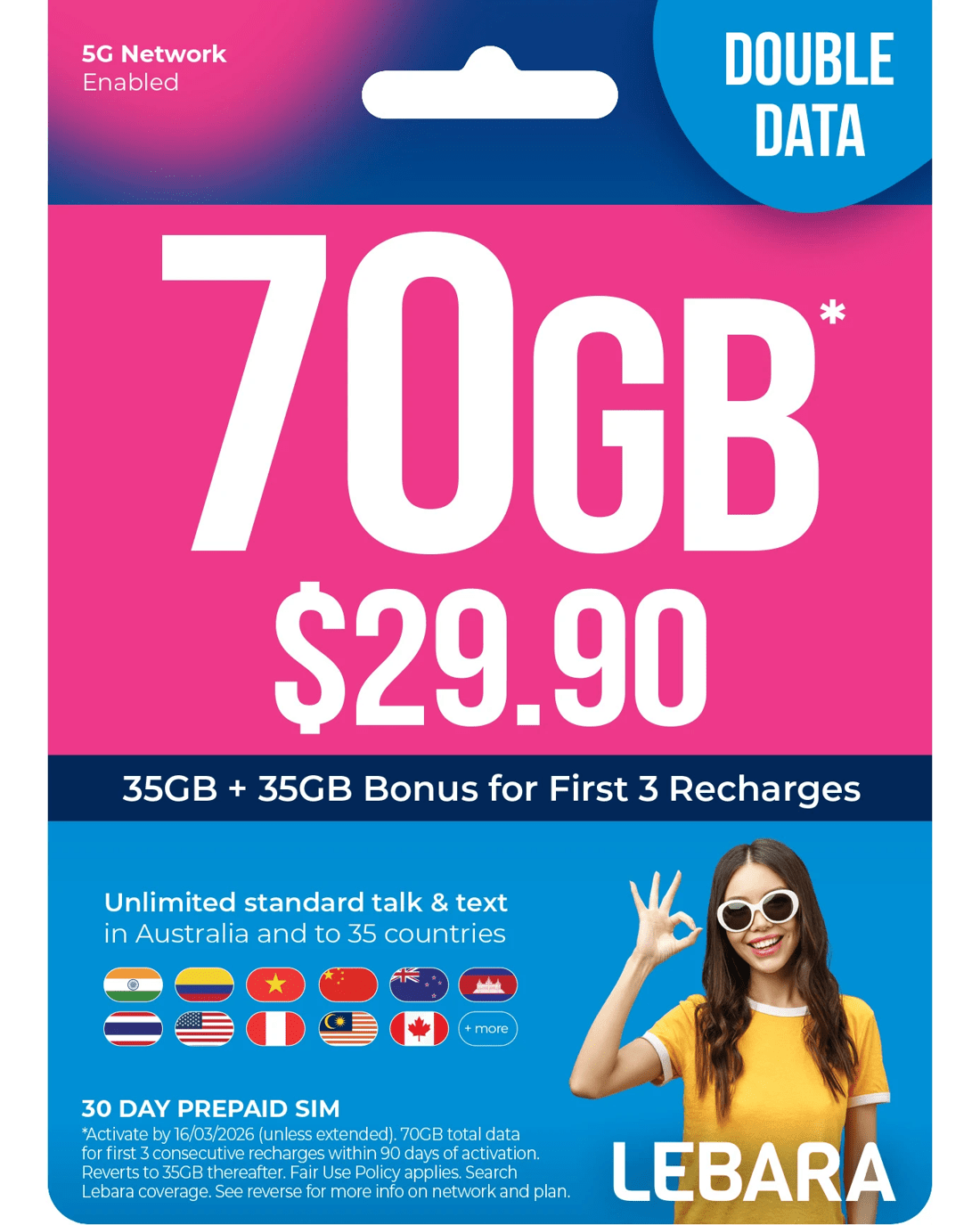 Disclaimer: Network coverage availability will vary depending on your device and location. See https://www.lebara.com.au/support/network/ for coverage. Terms and conditions apply.