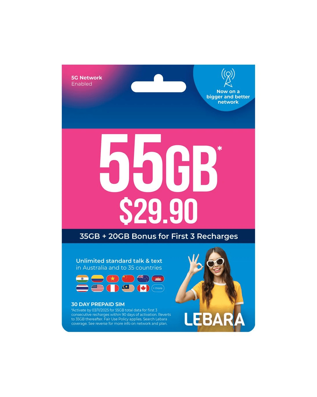 - The SIM includes $29.90 plan with 55GB data, 35GB + 20GB bonus for first 3 recharges within 90 days of activation, unlimited calls and texts in Australia and to 35 selected international countries. 30-day plan.