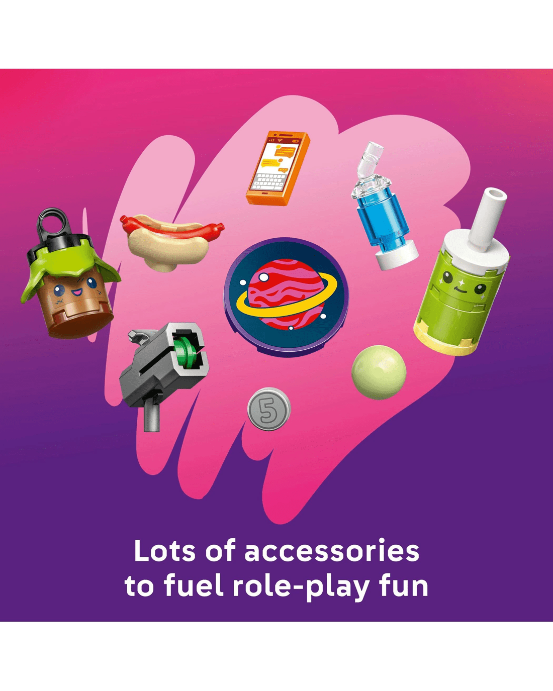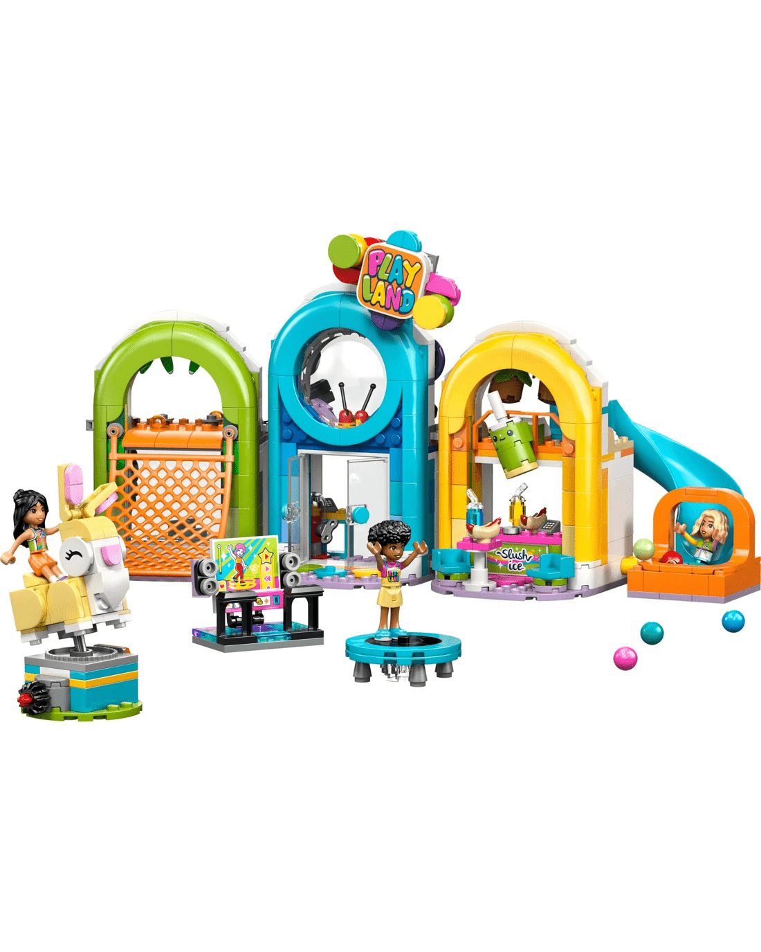 • LOTS OF ACCESSORIES – Fuel storytelling with slushies, hot dogs, a phone, a gumball machine, cash registers, a coin, plus a side build with a dance machine, a trampoline, a jumping bunny ride and more