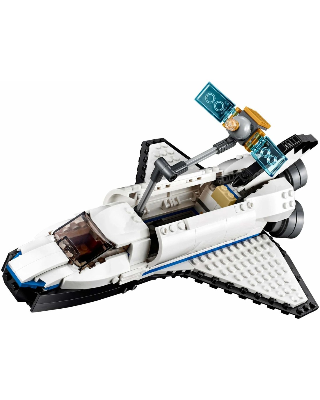 Carry out daring space missions with the Space Shuttle Explorer, featuring an authentic white, black, and gray color scheme, large engines, an opening payload bay with a robotic arm, a satellite with foldout wings, and a miniature cockpit with a tinted canopy. This 3-in-1 LEGO(R) Creator model rebuilds into a Moon Station or a Space Rover for further outer-space adventures. Also includes a minifigure.