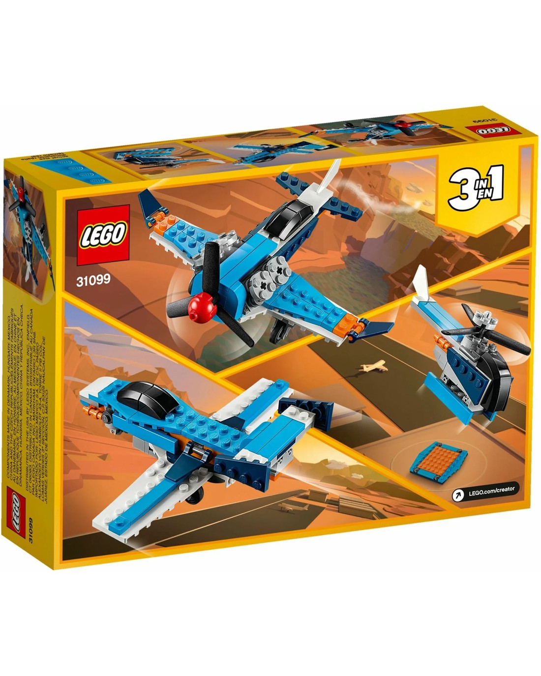 This set gives kids 3 options in each box: A Creator 3in1 Propeller Plane (31099), jet plane, or helicopter, which can be played with on its own or with other LEGO(R) sets. Kids can grow their building skills and have fun.