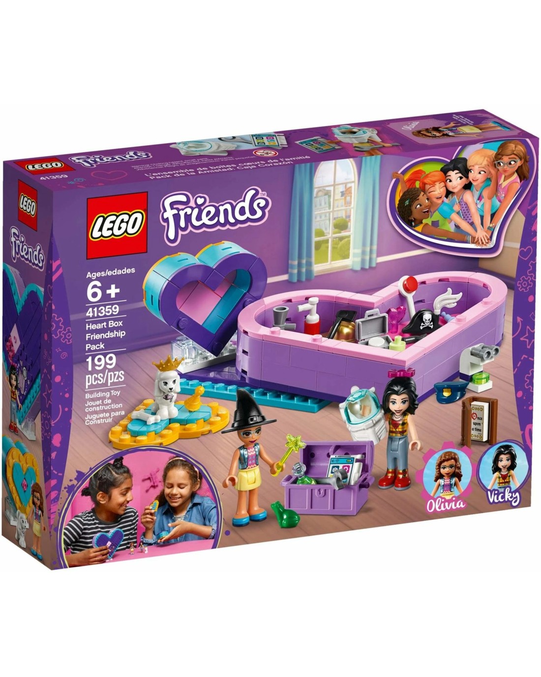 LEGO(R) Friends 41359 Heart Box Friendship Pack is the ideal gift for children who love imaginative play. This set features 2 buildable heart boxes, large and small, for our friends Vicky and Olivia. As one girl reads a story, help the other act out the plot using the dress-up sets. The multitude of accessories help with the role-play-pretend you're a pirate, or maybe solving a crime with the police costume. You can even mix and match the roles so you're an astronaut with a magic wand! The scenarios are endless, so imaginations can really run free. This pretend play set is great for travel, as every element fits into the heart-shaped boxes, and the lids keep all the pieces together. Remove the lid of the larger box to use it as a stage where the girls can stand securely-perfect for play on the go. Includes 2 mini-dolls: Vicky and Olivia, plus 2 animal figures: a poodle and a frog.