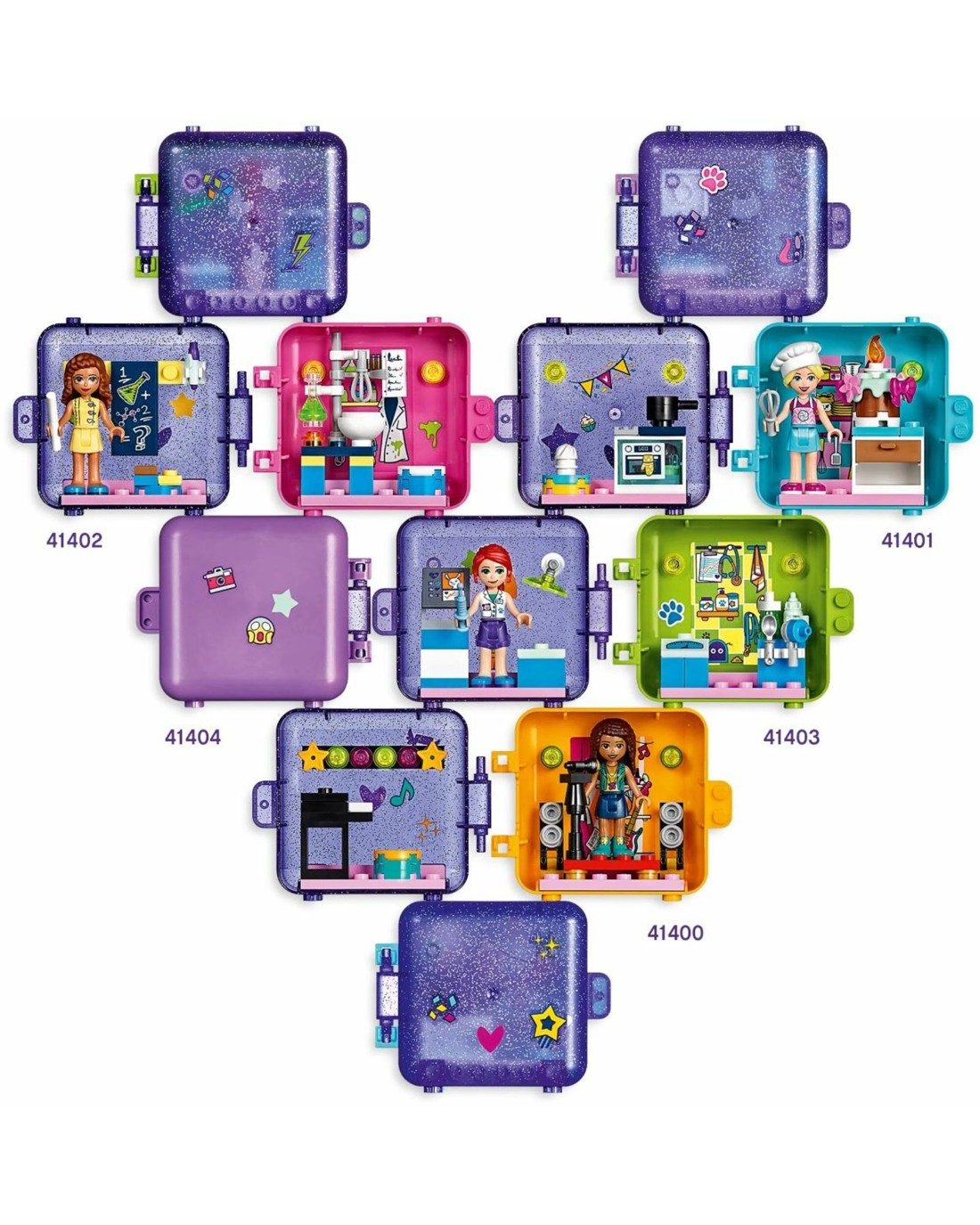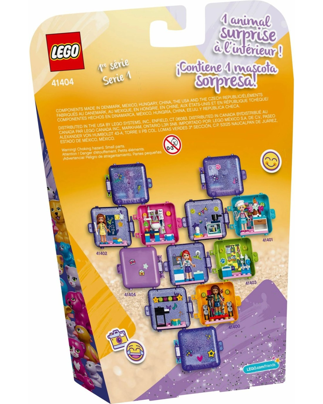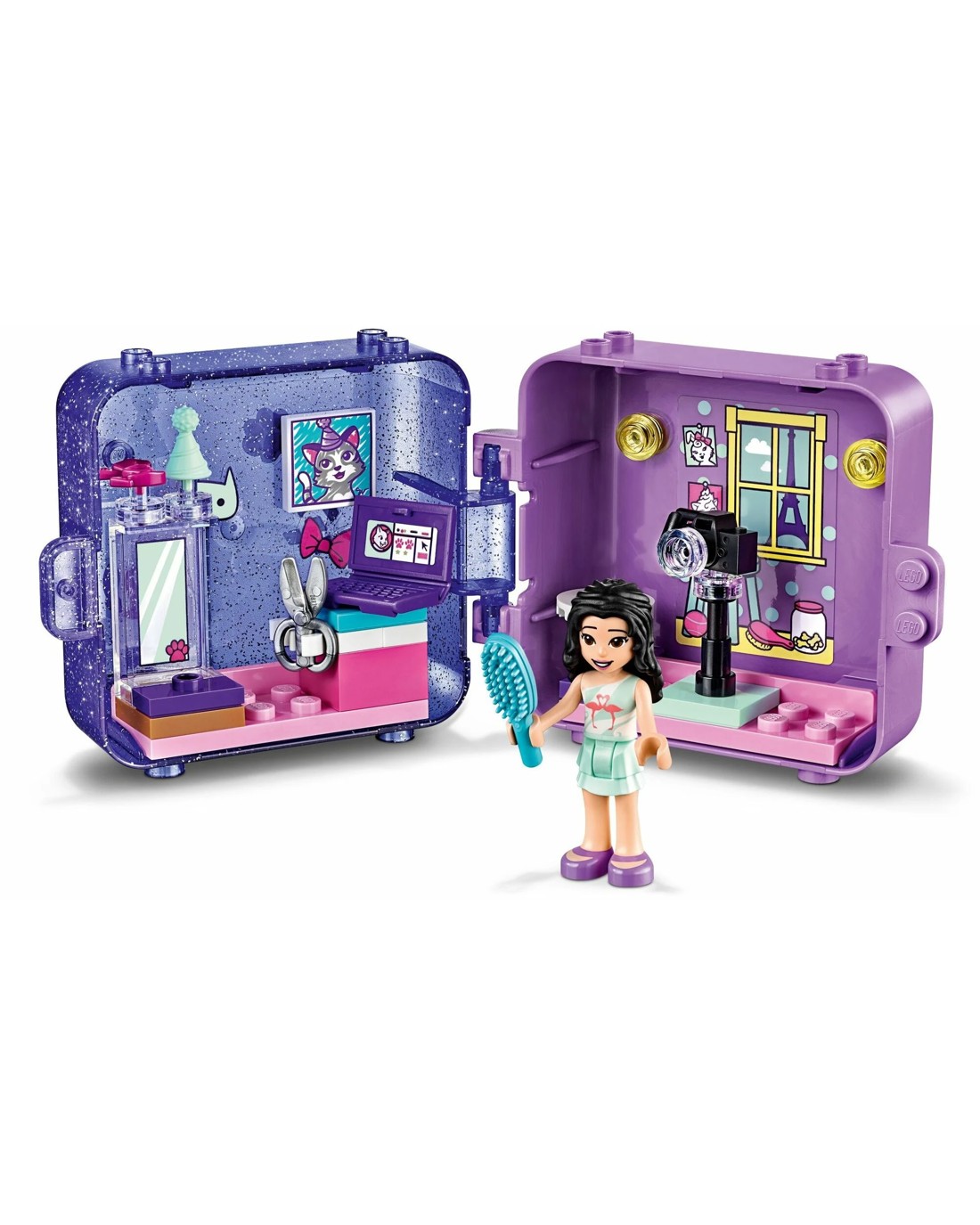 Inspire creative play with LEGO(R) Friends Emma's Play Cube (41404). Inside the pretty transparent glitter cube is a miniature world of photography fun. Watch kids open the case to reveal the cute mystery pet inside.