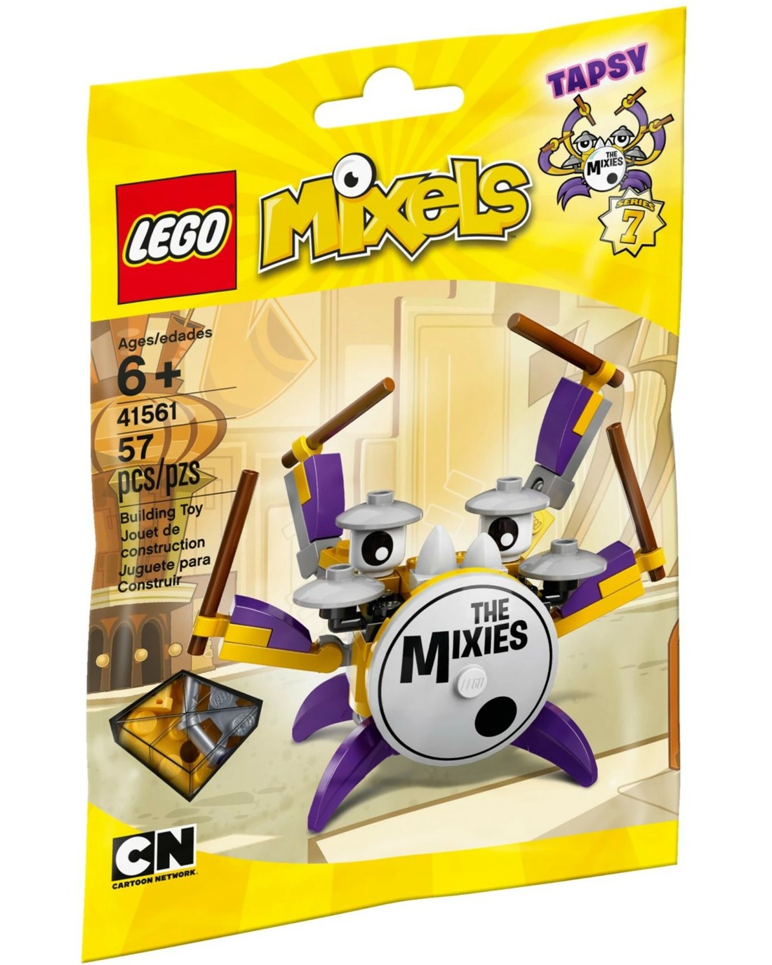 Drum-kit-shaped Tapsy features 4 posable arms with drumsticks, minifigure-head-shaped eyes, drum-cymbal 'hats', 2 other cymbals and 'The Mixies' band logo on the kick drum.