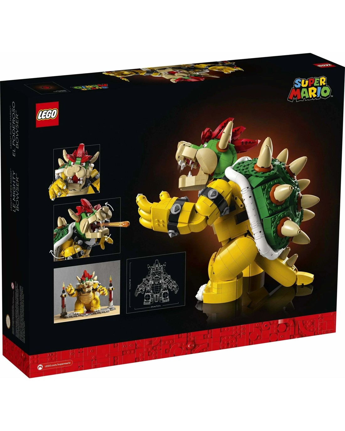 The Mighty BowserTM display piece This LEGO(R) Super MarioTM character model, including the display stand, measures over 32 cm (12.5 in.) high, 41 cm (16 in.) wide and 28 cm (11 in.) deep