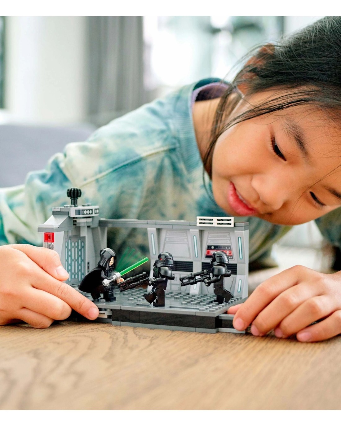 : The Mandalorian Season 2 with this buildable Dark Trooper Attack playset (75324) for fans aged 8+. It features an authentically detailed recreation of the scene inside the Imperial Light Cruiser where Luke reappeared, with a revolving elevator, rotating battle platform and a sliding 'Force' platform to fend off Dark Troopers. There are 4 LEGO(R) minifigures in the set: a new-for-March-2022 Luke Skywalker with a lightsaber, and 3 Dark Troopers, each with blaster rifles, to inspire fun, creative role play.