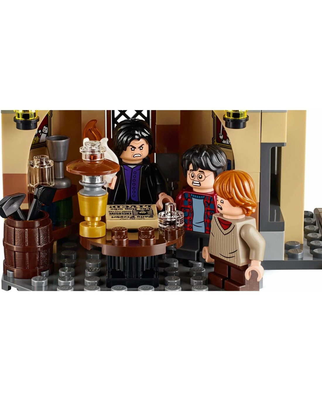Includes 6 minifigures: Harry PotterTM, Ron WeasleyTM, Hermione GrangerTM, Seamus FinniganTM, Argus FilchTM, and Severus SnapeTM, plus a HedwigTM owl figure.