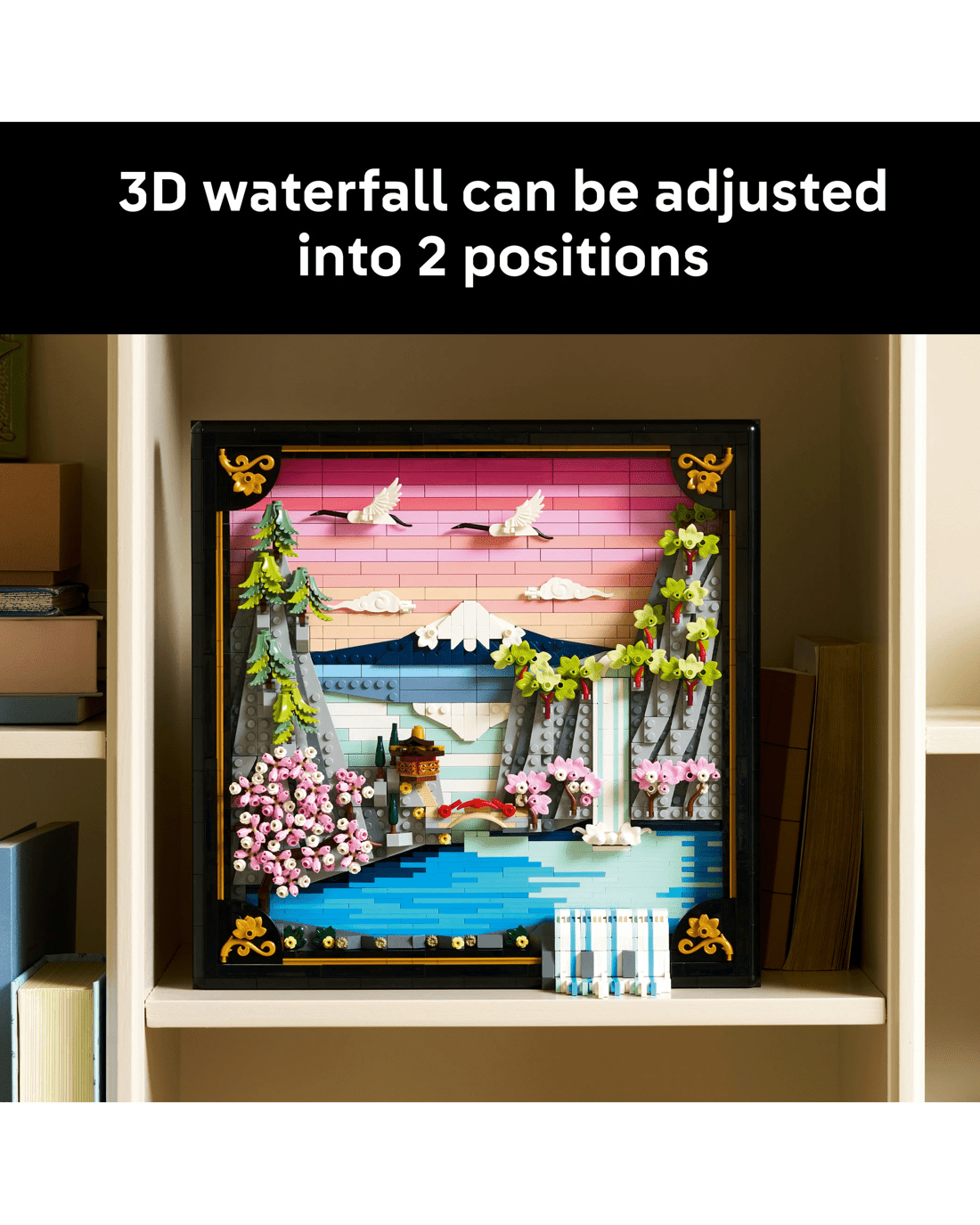 - Adjustable 3D Waterfall - The LEGO Art set features a waterfall that flows beyond the frame so on a wall it pours directly out, or when stood up it can be adjusted to spill onto a flat surface
