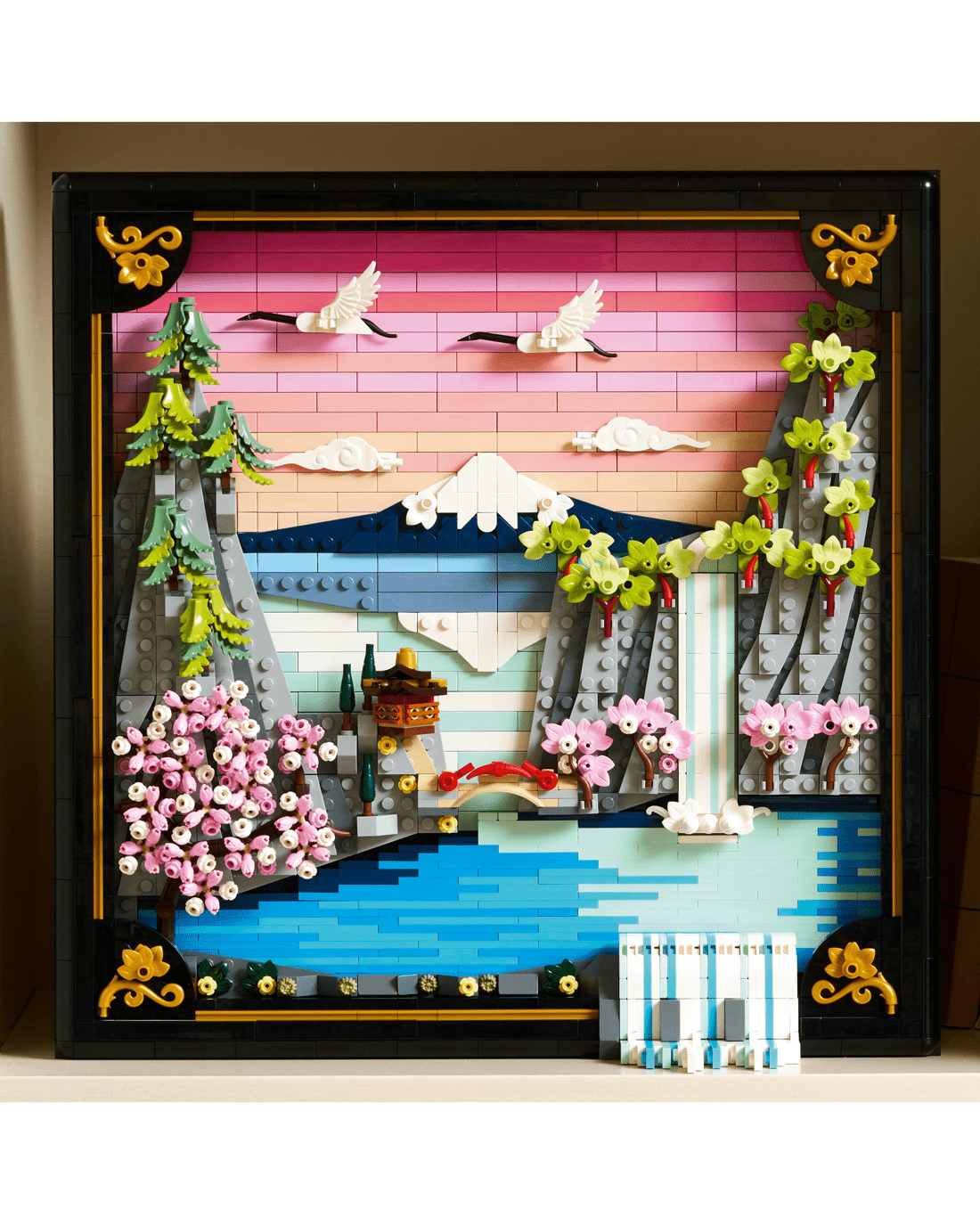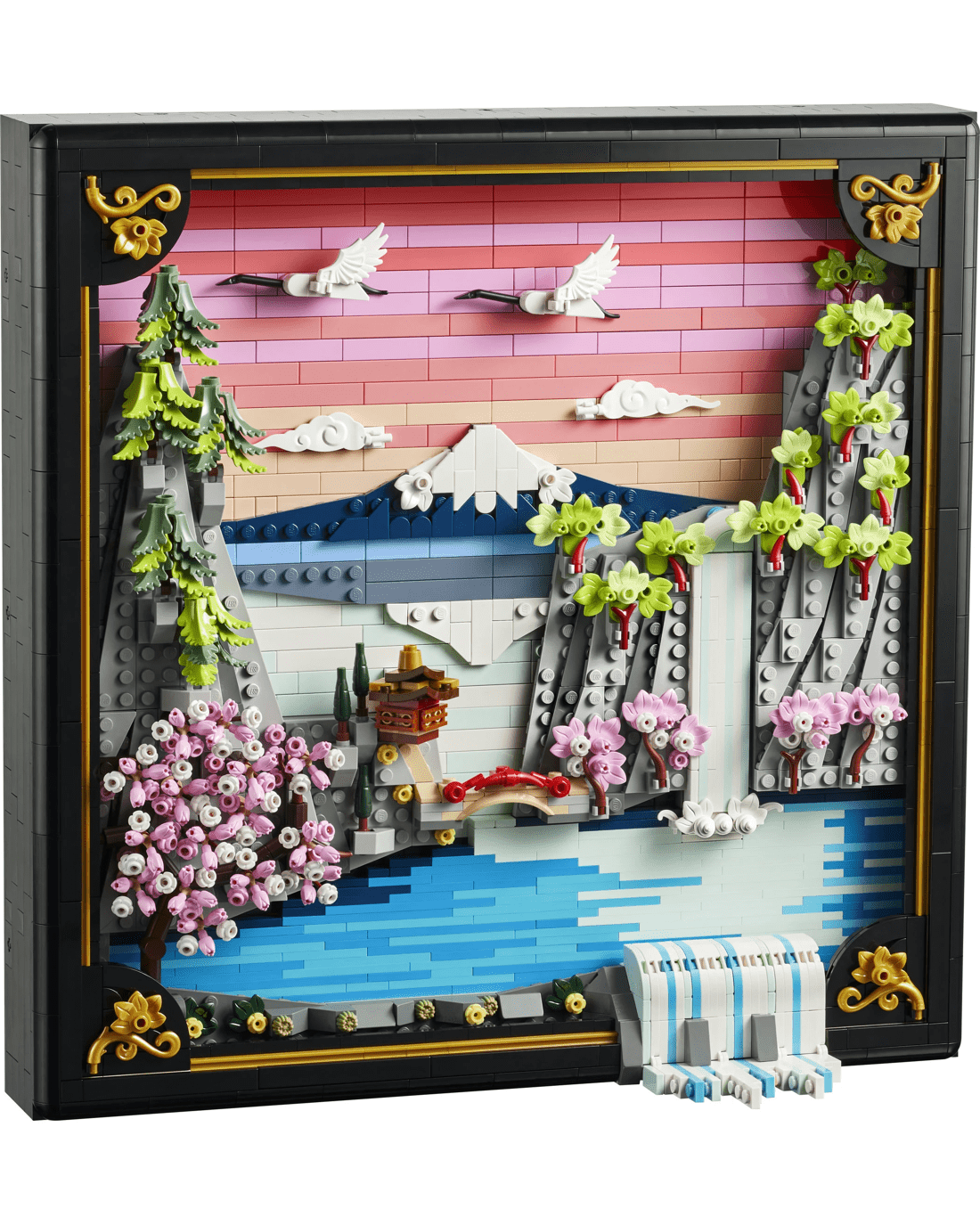 Bring colour and nature into your home with this LEGO Art Japanese Cherry Blossom Landscape building set for adults. Inspired by the beauty of springtime in Japan and the country’s Ukiyo-e artists, this stunning brick-built 3D wall art features Mount Fuji, a teahouse, a bridge, a waterfall, flying Japanese cranes and cherry blossom, 'Sango-Kaku' maple and Japanese umbrella pine trees.