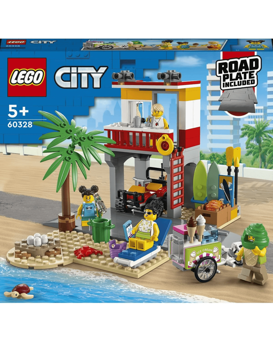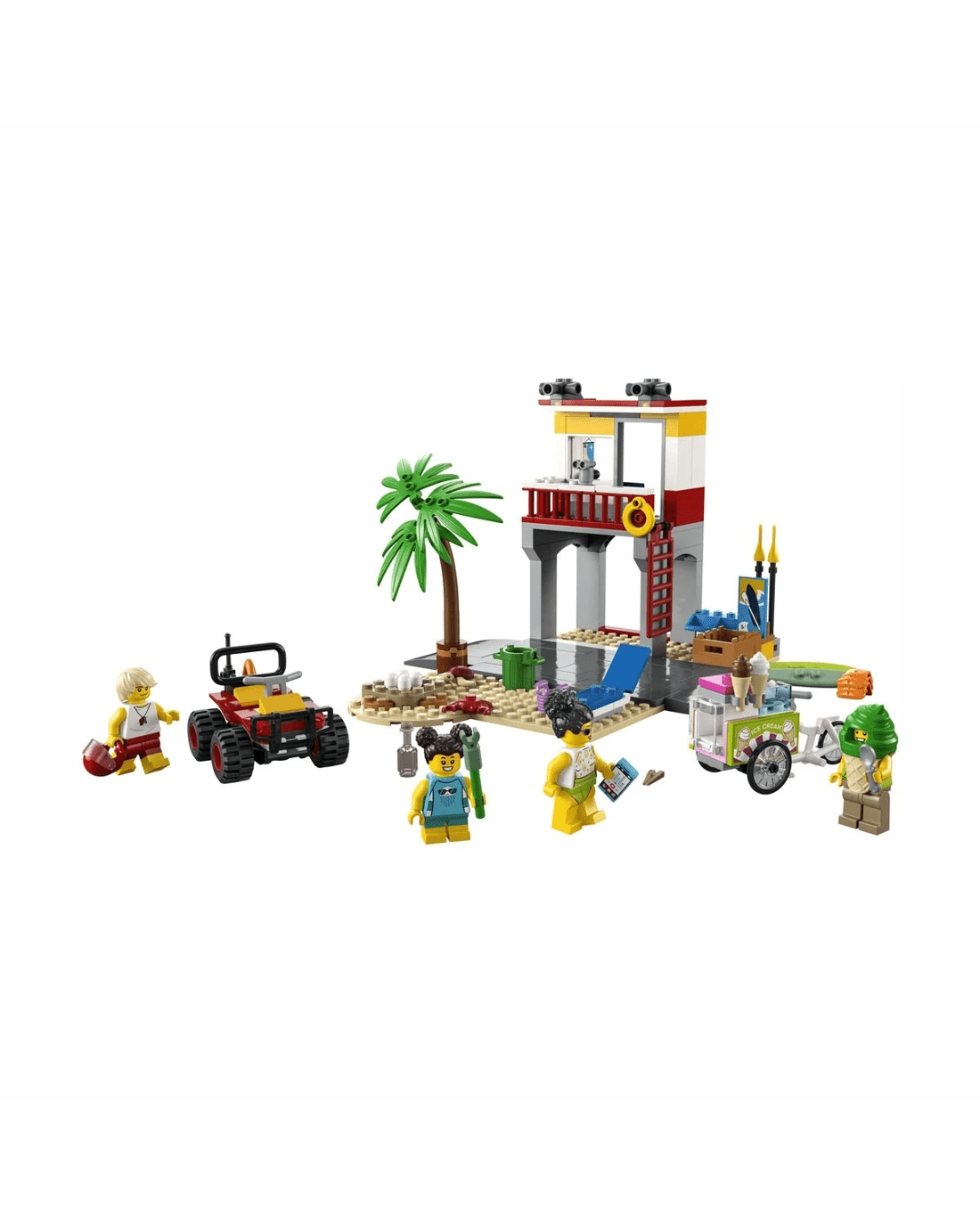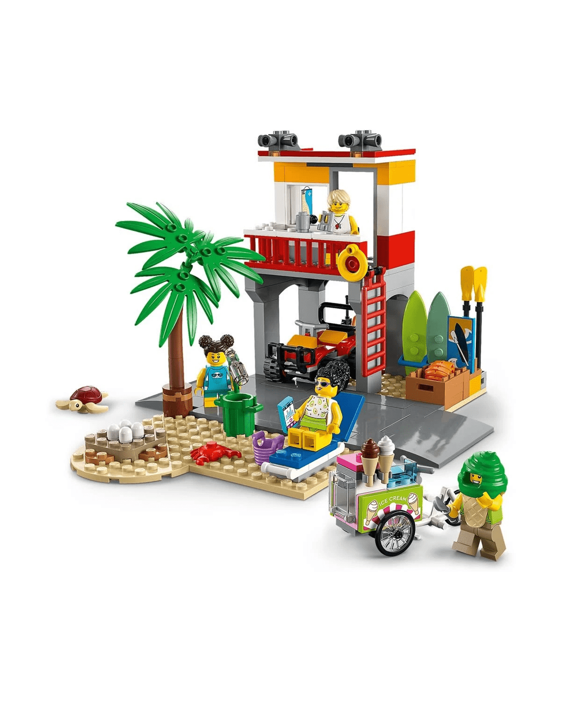 • What's in the box? - Everything kids need to build a 2-level Lifeguard Station, ATV, ice-cream cart and beach setting with a palm tree, plus 4 minifigures and crab and turtle figures