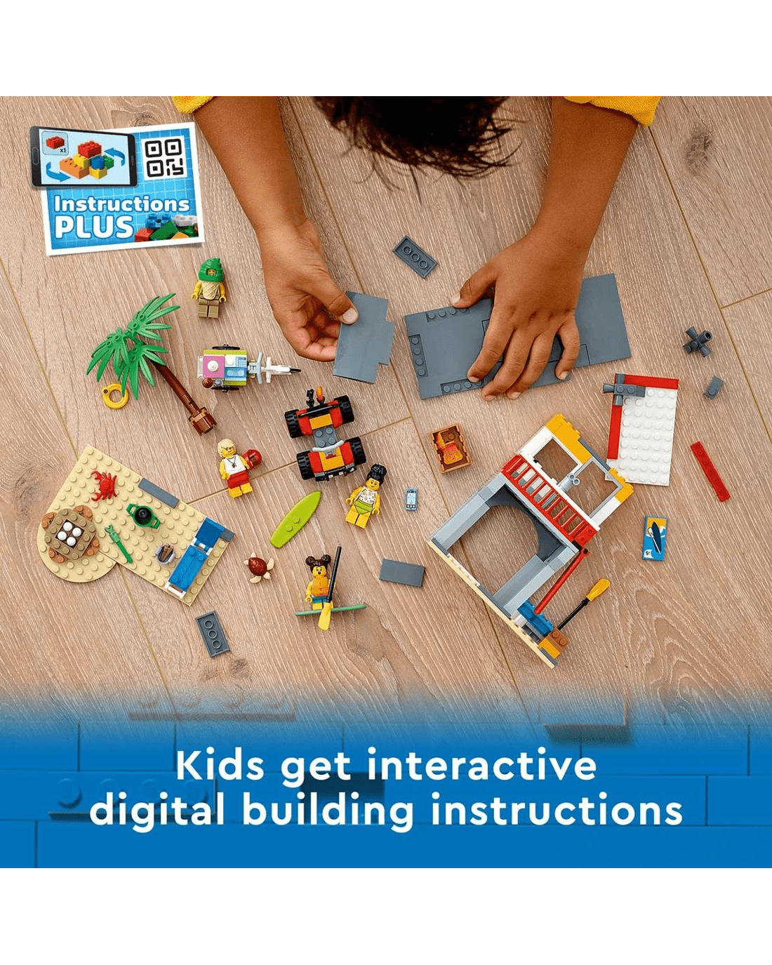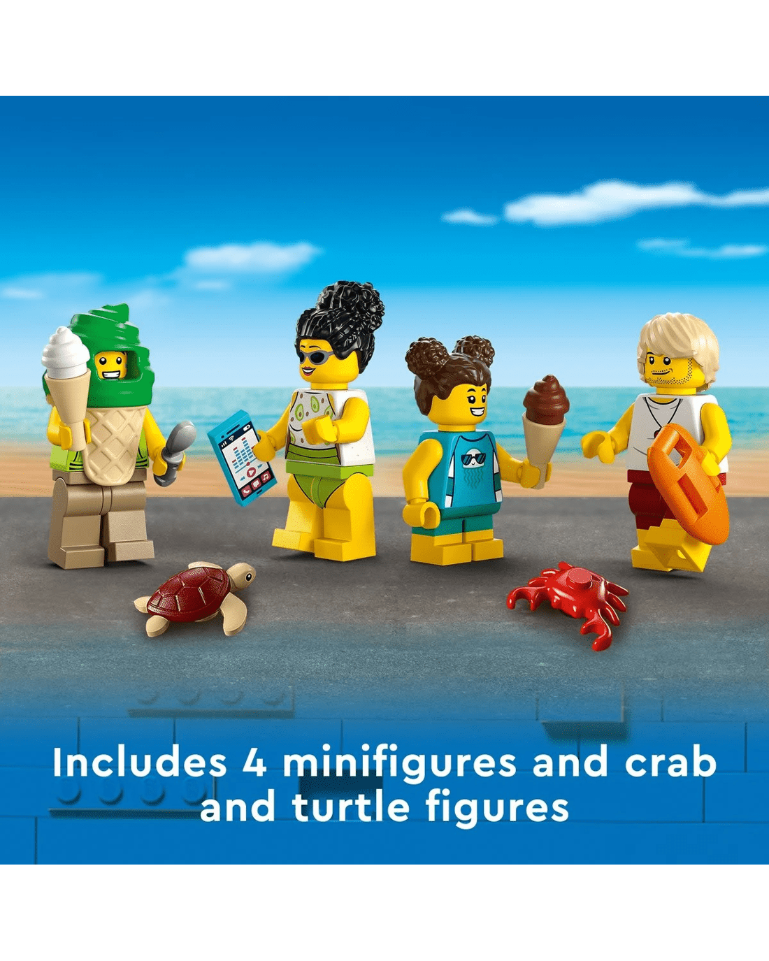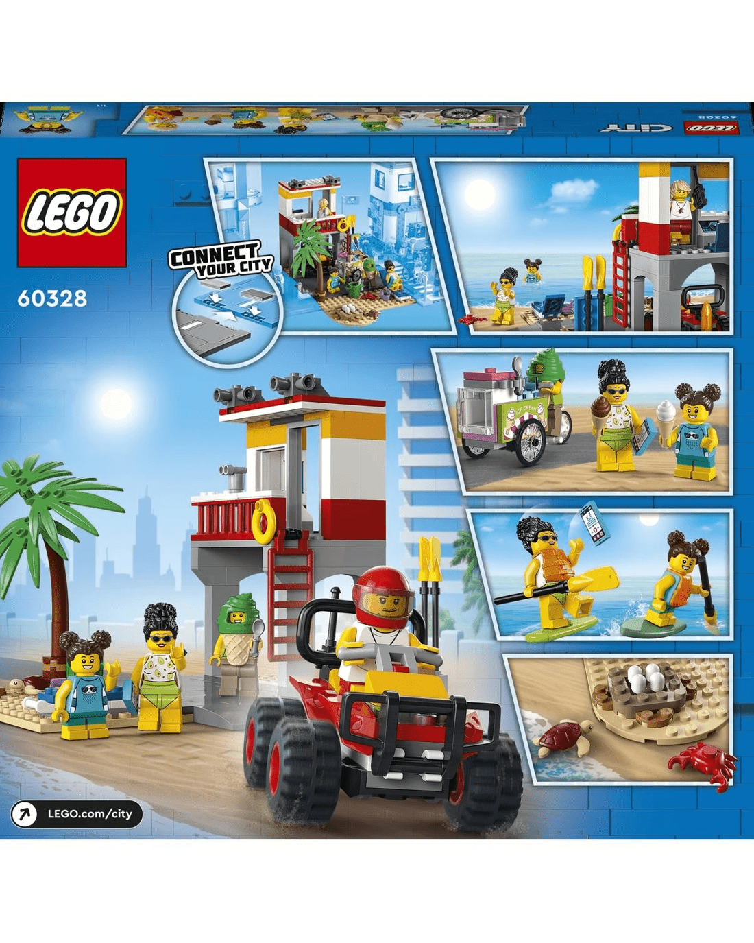• What's in the box? - Everything kids need to build a 2-level Lifeguard Station, ATV, ice-cream cart and beach setting with a palm tree, plus 4 minifigures and crab and turtle figures