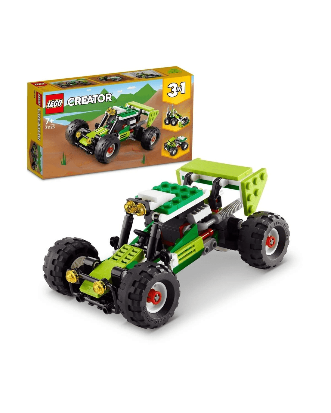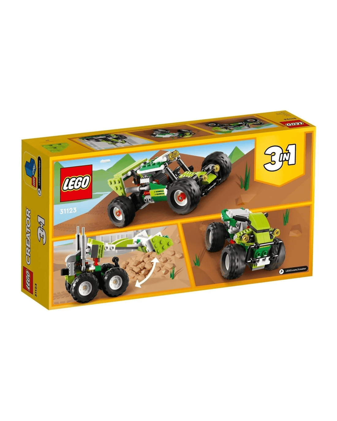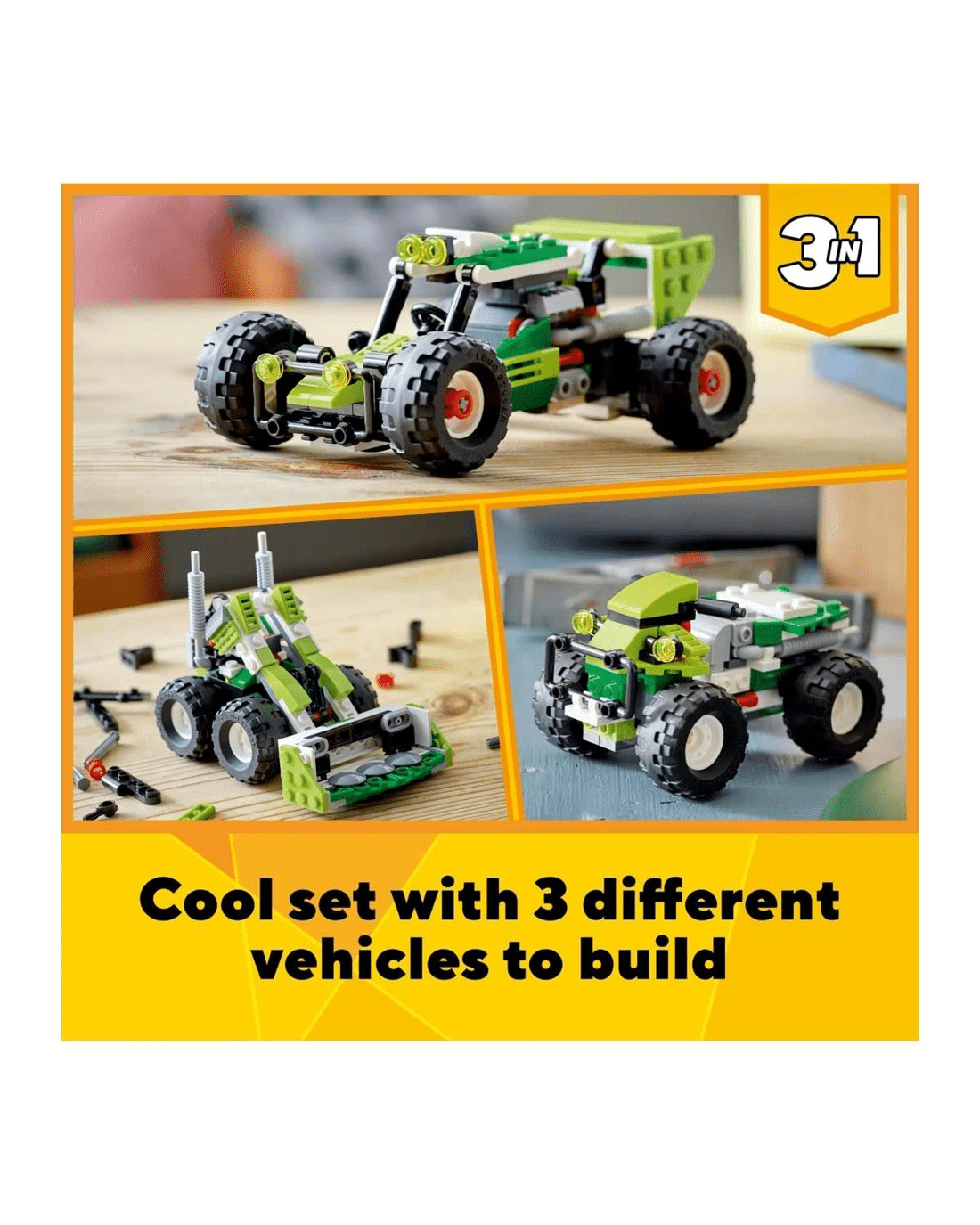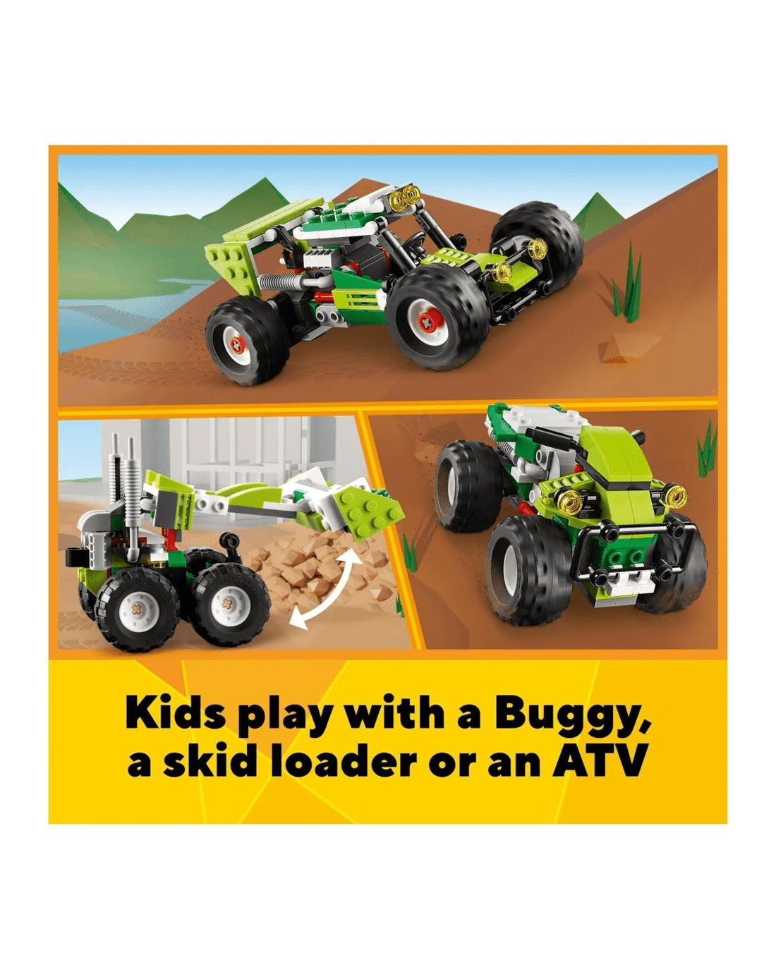 - 3-in-1 toy - Kids can enjoy imaginative play with the LEGO Creator 3in1 Off-road Buggy set, featuring 3 models in 1: a buggy, a skid loader and an ATV (All-Terrain Vehicle)