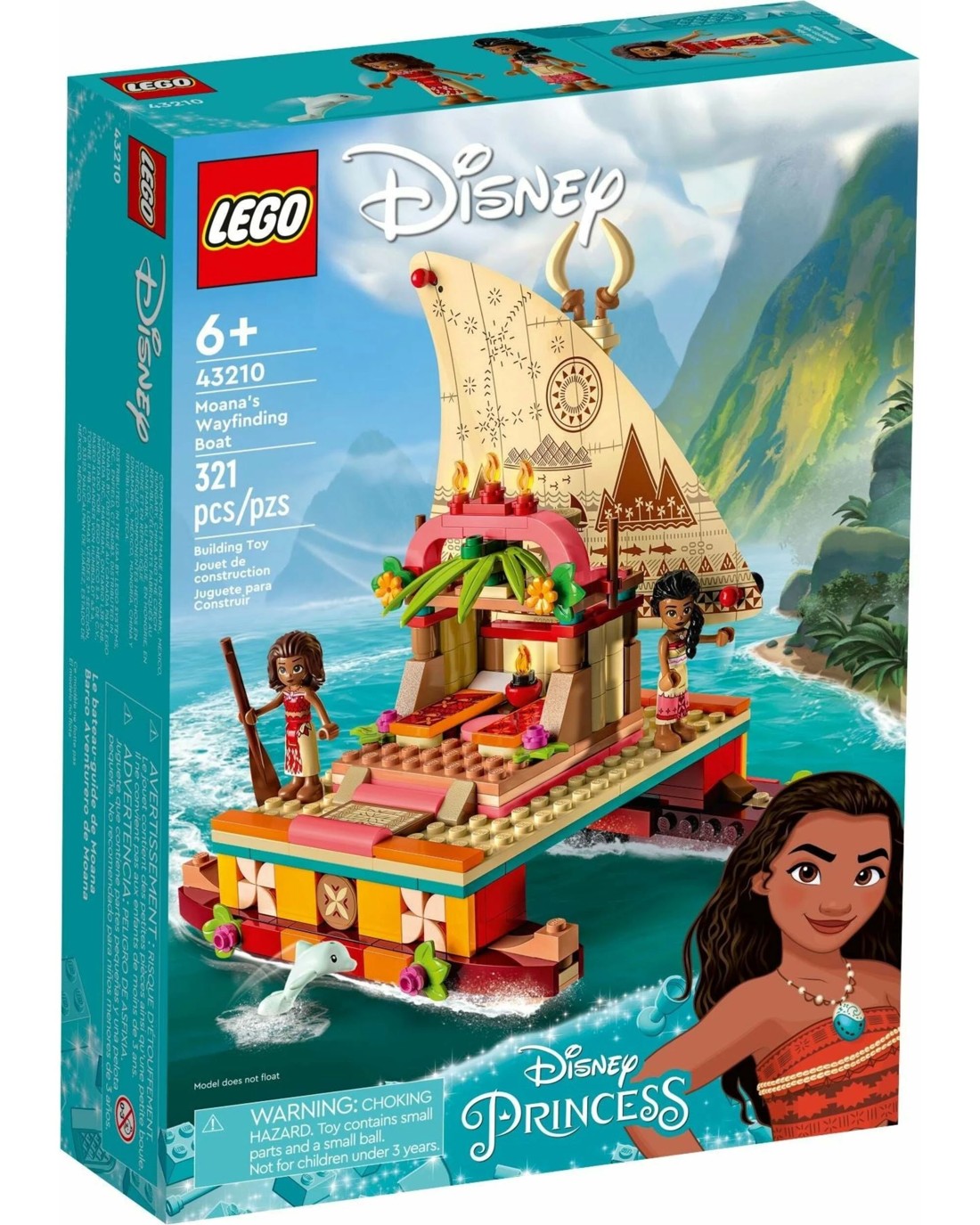 Adventure awaits any child aged 6+ or fan of Disney's Moana with this imaginative LEGO(R) | Disney Moana's Wayfinding Boat (43210) set. The kit features a double-hulled boat with a removable shelter and printed sail, storage space, 2 LEGO mini-doll figures, a LEGO dolphin figure, and decorative elements. Let the LEGO Builder app guide kids on an intuitive building adventure, allowing them to zoom in and rotate models in 3D, save sets, and track their progress.