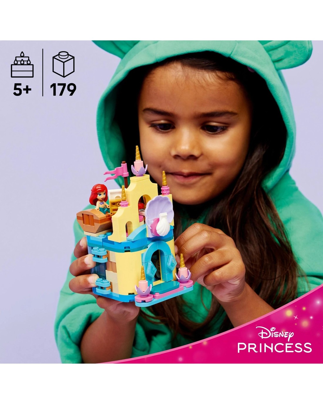 Treat Disney's The Little Mermaid fans to a building toy featuring a mini castle, a small boat, accessories and 3 LEGO® ǀ Disney Princess characters. Kids can explore their creative side with this LEGO® ǀ Disney Princess Ariel's Magical Mini Palace (43285) fantasy building set for Disney's The Little Mermaid fans aged 5 and over. The micro-world buildable playset is a small toy with a world inside and out. This LEGO building toy for girls and boys comes with 3 LEGO ǀ Disney characters: Ariel, Flounder and Sebastian, a mini palace and grotto that can be closed and locked with the key, a small boat and much more. The portable micro-castle building toy is made for on-the-go fun.This fun gift-giving idea is great for girls or boys as a birthday or anytime treat, and the buildable castle playset is full of features and accessories for endless pretend play. As they create their own stories, kids can gain confidence and stretch their imaginations. Plus, they can enjoy intuitive building with the LEGO Builder app, zooming and rotating with 3D instructions, while saving and tracking progress. Contains 179 pieces. Dive into underwater adventures with Disney's Ariel, Flounder and Sebastian! Take a swim with Ariel and her friends through the palace and into Ariel's grotto where she keeps her treasure chest. Ooh, look inside and see what you find. Head back to the palace in the boat; Sebastian is about to put on a musical show. Ariel decided to take her dolphin carriage, and she's here now. Time for some music! Ages 5 +