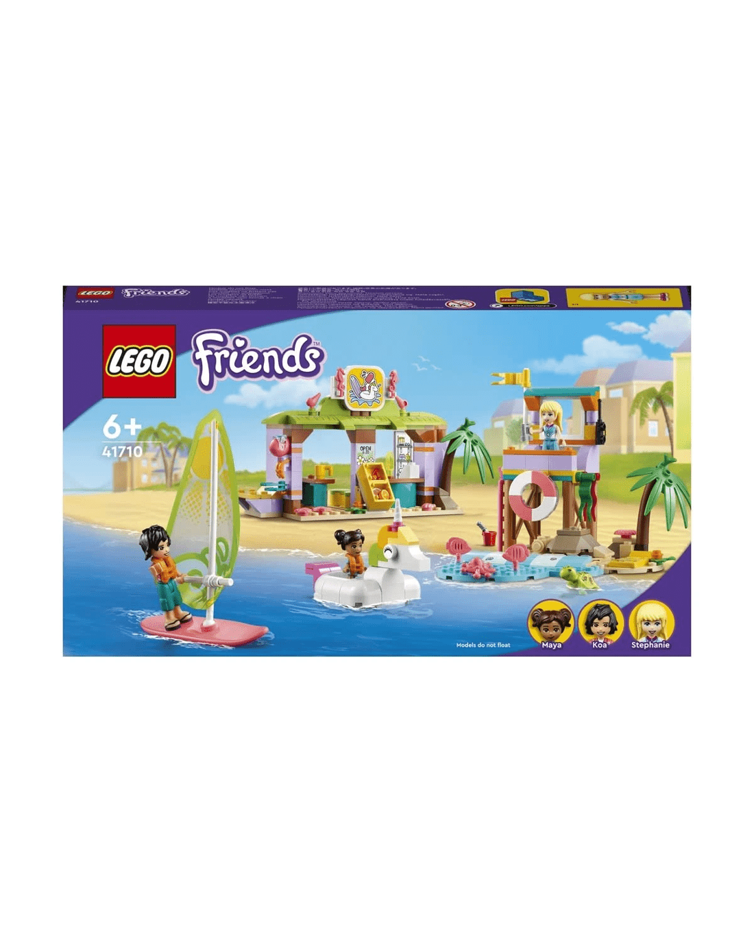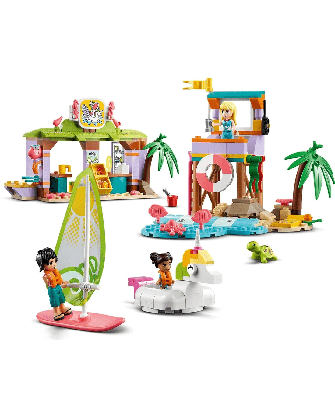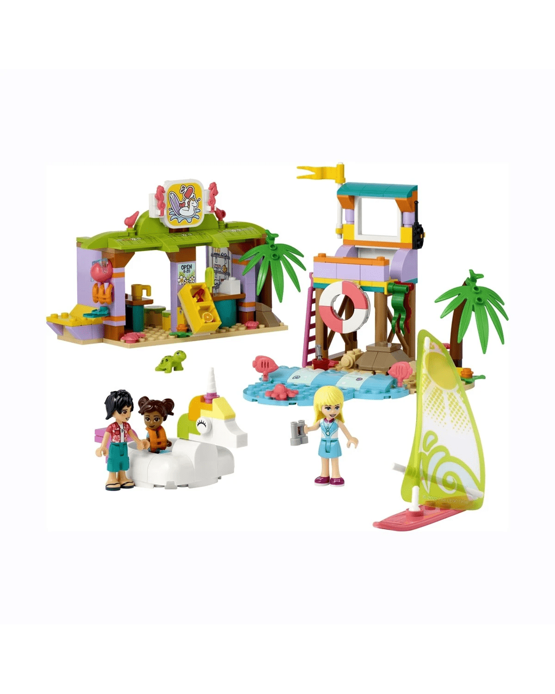 • Lots to explore - Comes with a lifeguard tower, unicorn-shaped floatie, sailboard, surf school with classroom, shower and rental store, plus LEGO Friends Stephanie, Koa and Maya