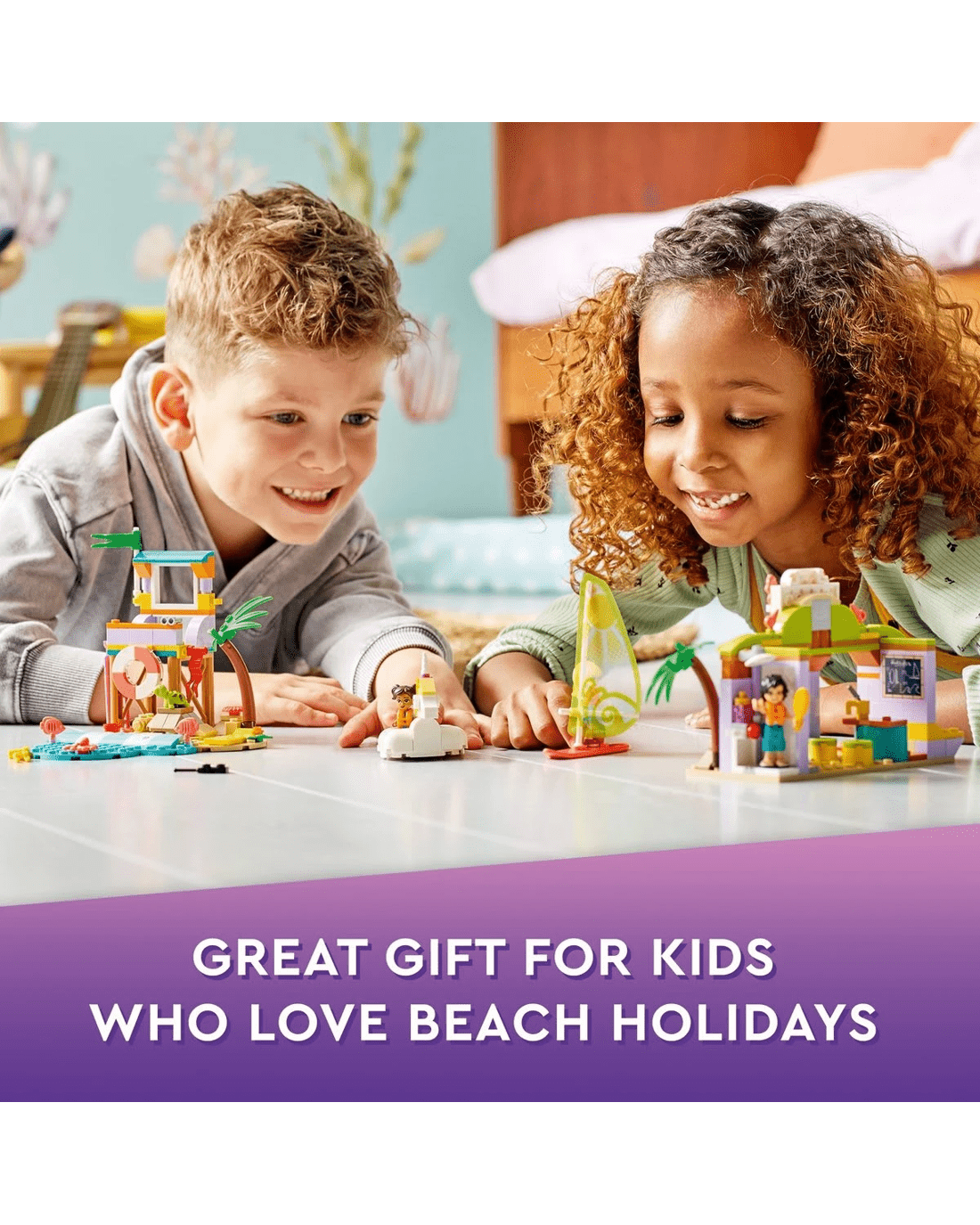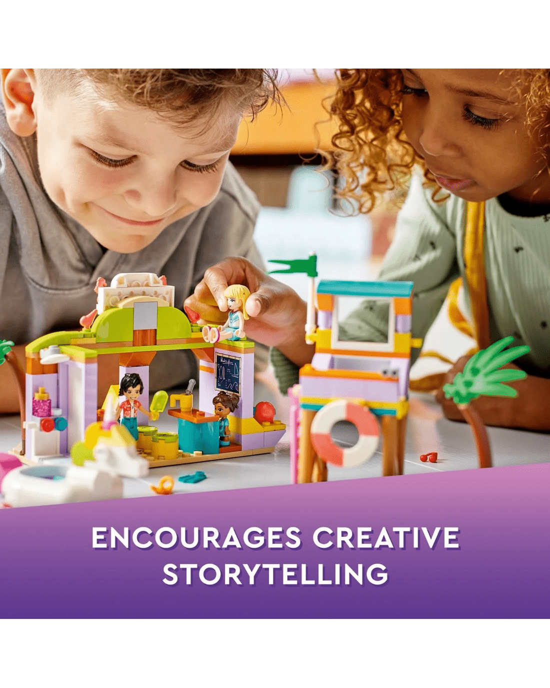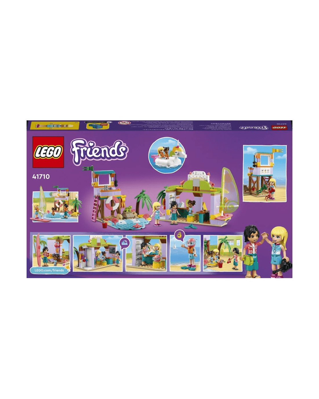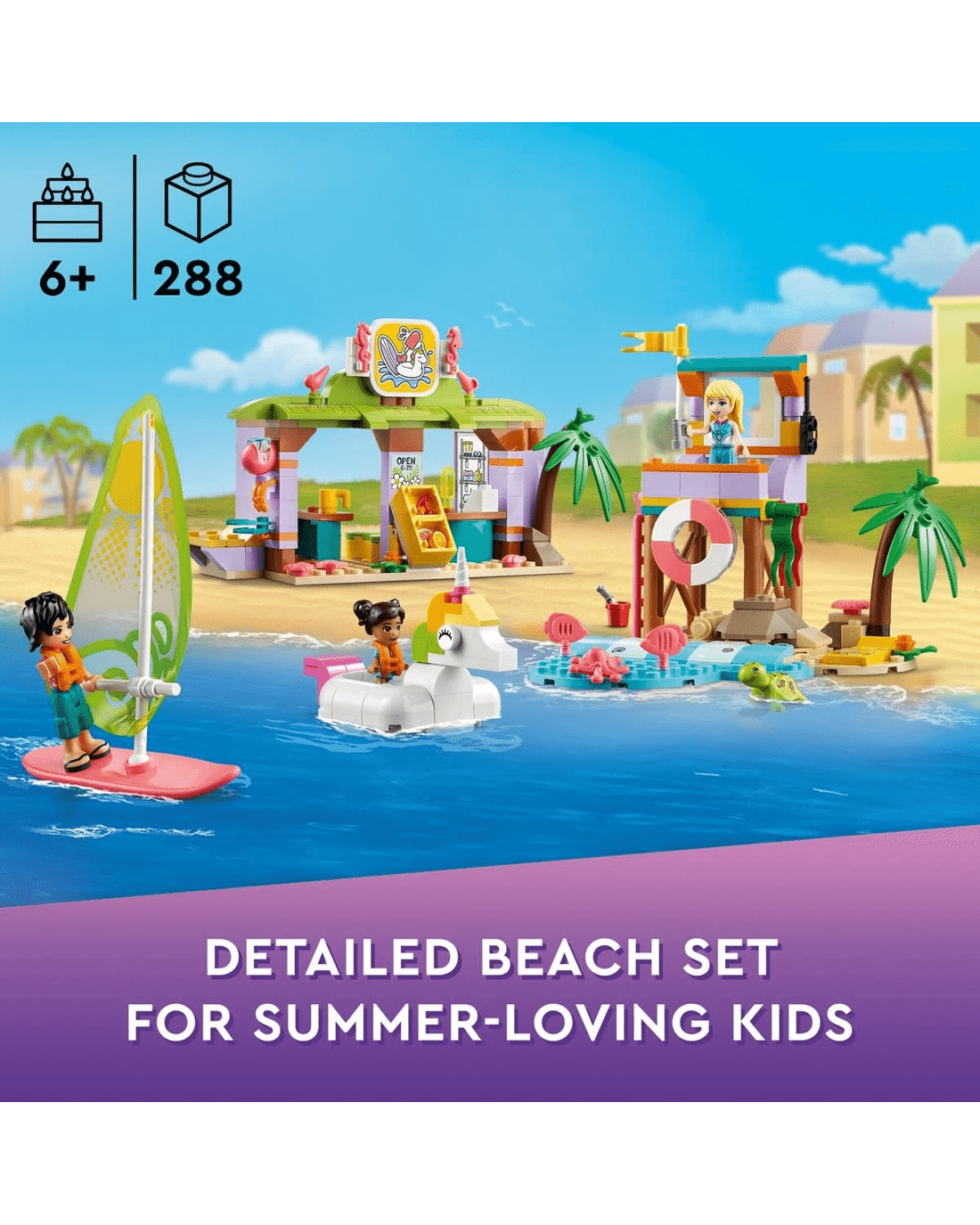 • Lots to explore - Comes with a lifeguard tower, unicorn-shaped floatie, sailboard, surf school with classroom, shower and rental store, plus LEGO Friends Stephanie, Koa and Maya
