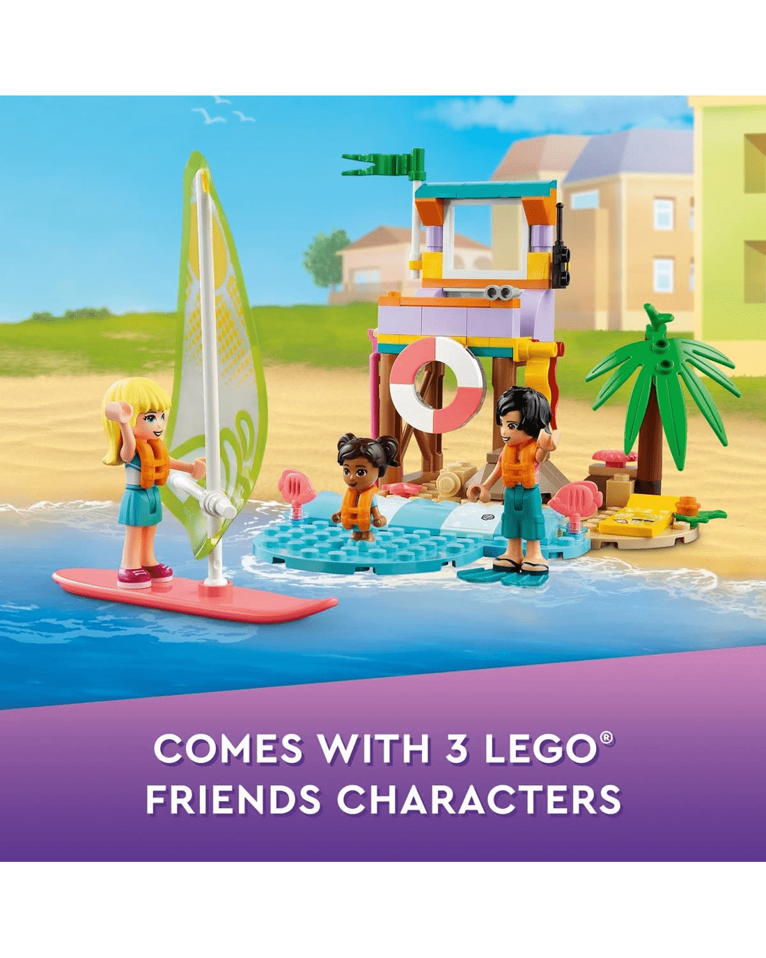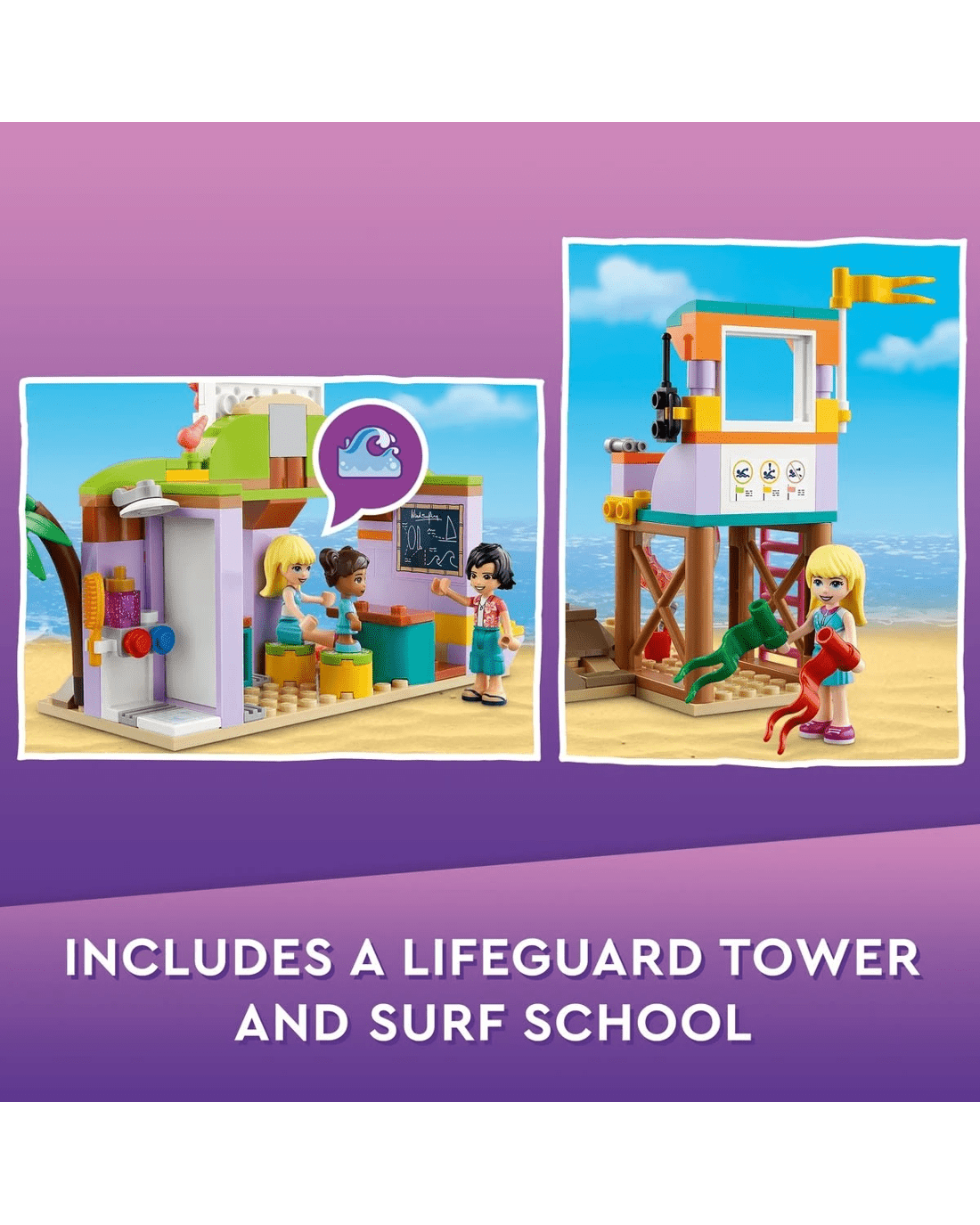 Kids join LEGO Friends Stephanie at the beach in her lifeguard tower, making sure everyone is safe. They can run the surf school, serve customers in the rental store, catch big waves on a surfboard, enjoy swimming in the sea with flippers and a snorkel, or have fun playing at the beach with the pail and shovel toys.