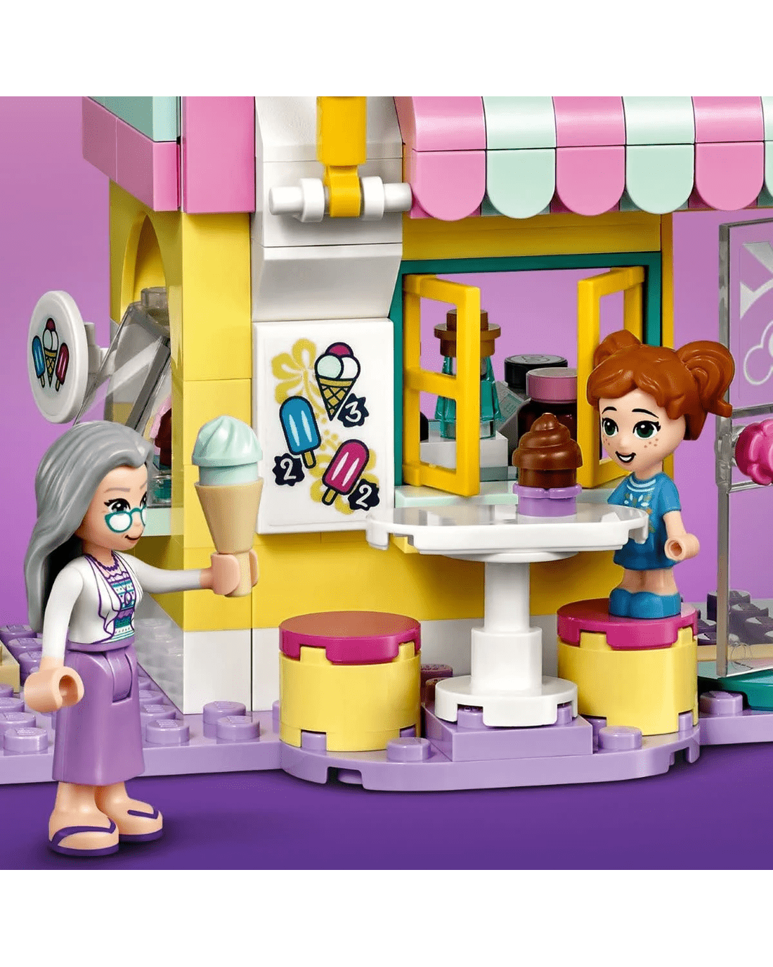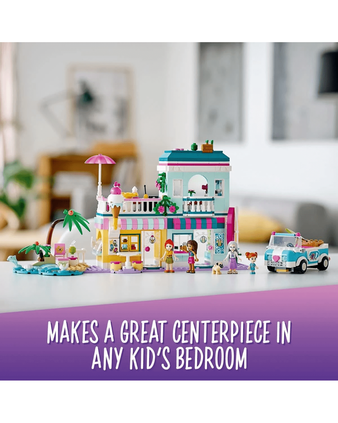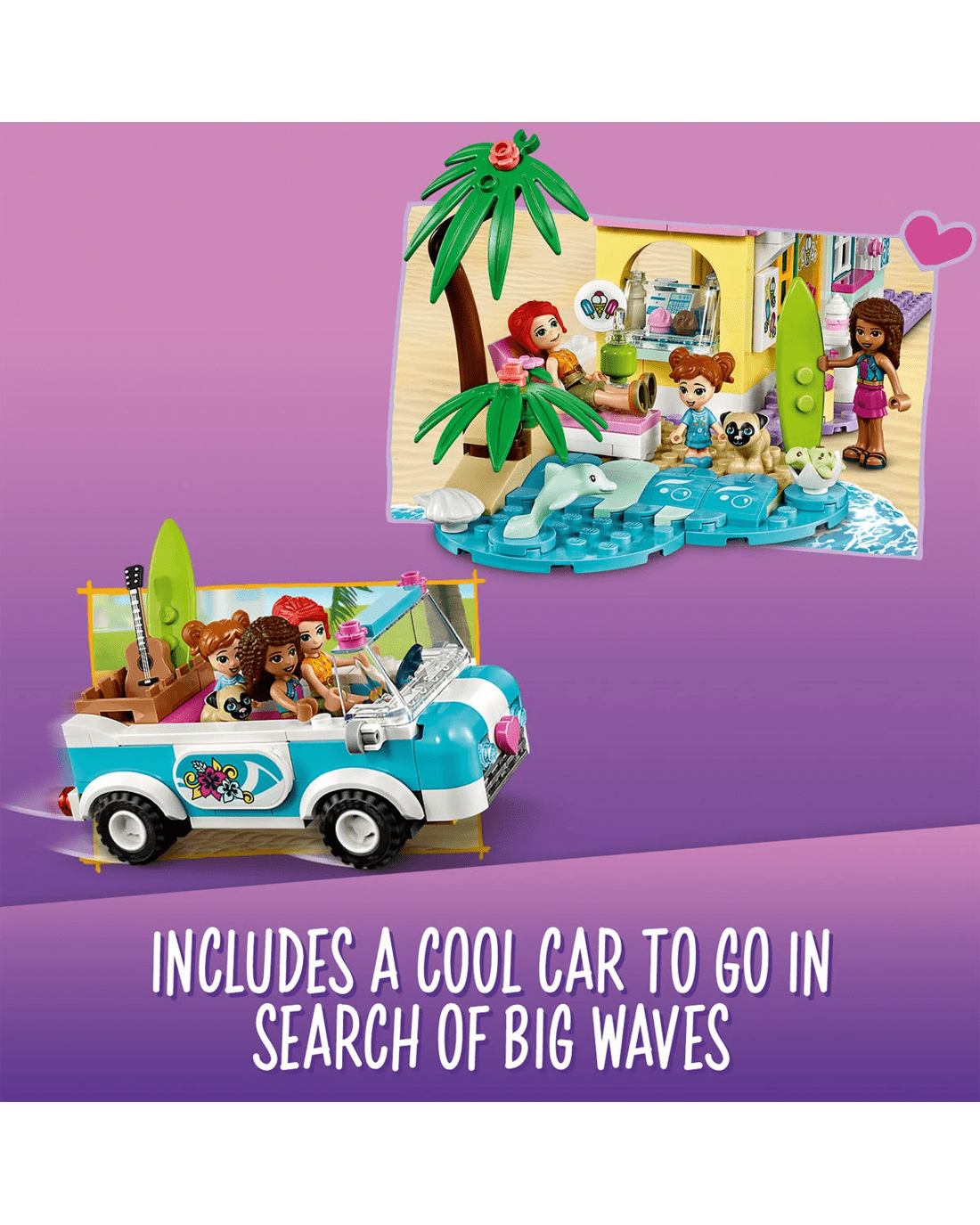 - Toy playset includes a beach gear rental store, an ice cream shop and an apartment. Comes with an open-top car, LEGO Friends Mia and Andrea, a micro-doll, plus dog, dolphin and turtle toys for kids.