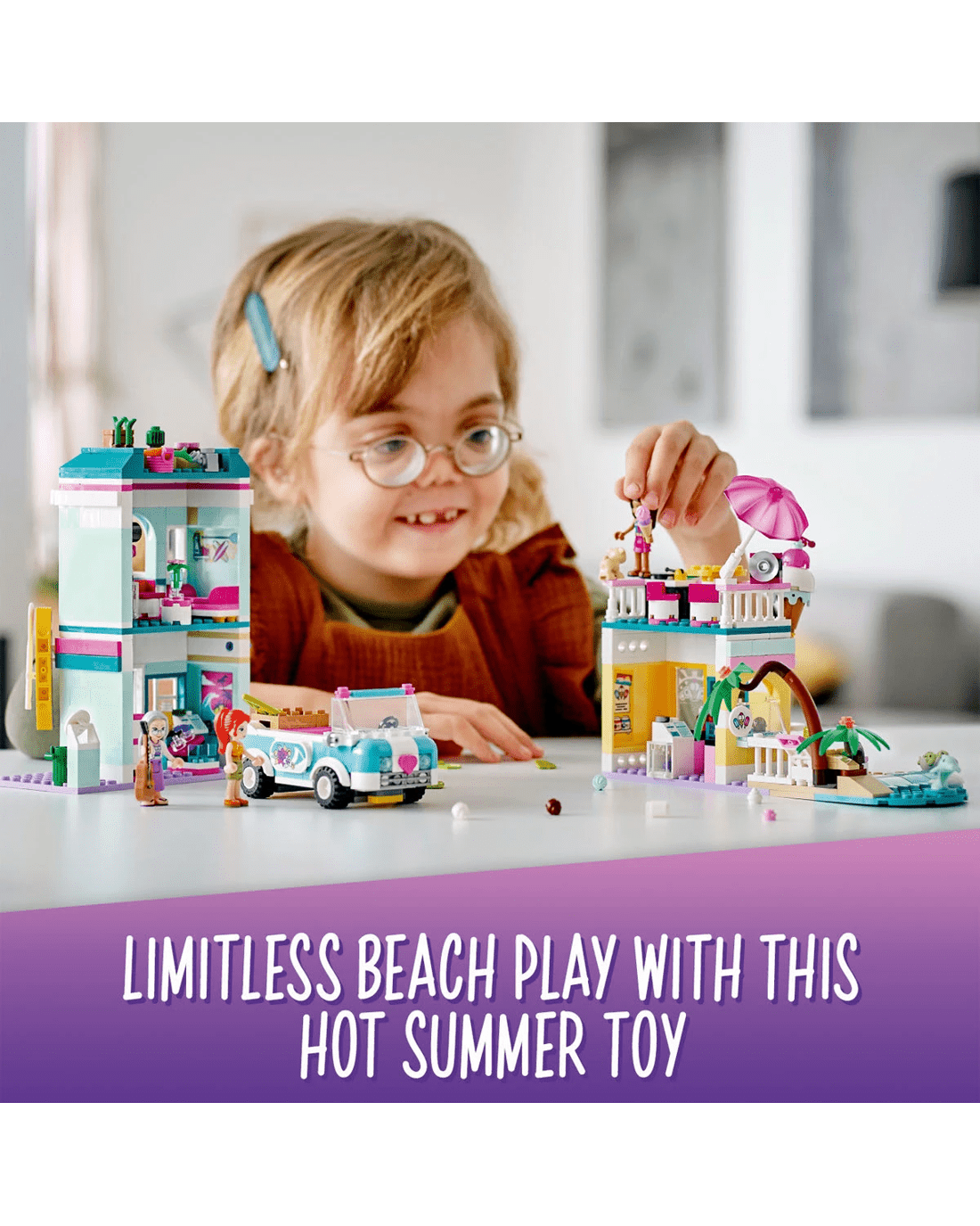 The 2-story building houses an ice cream shop with roof terrace, a beach gear rental store and LEGO Friends Mia's grandmother's apartment and vegetable garden. The set comes with a cool open-top car, which Andrea and Mia can load up with their boards as they go in search of the surf. At the beach they can ride the waves and play with the dolphin and turtle toys. Like all LEGO Friends sets it includes a wealth of accessories to spark creative storytelling. A toy guitar, record player and sunscreen are just some of the elements included to help kids on their way to imaginative holiday adventures.