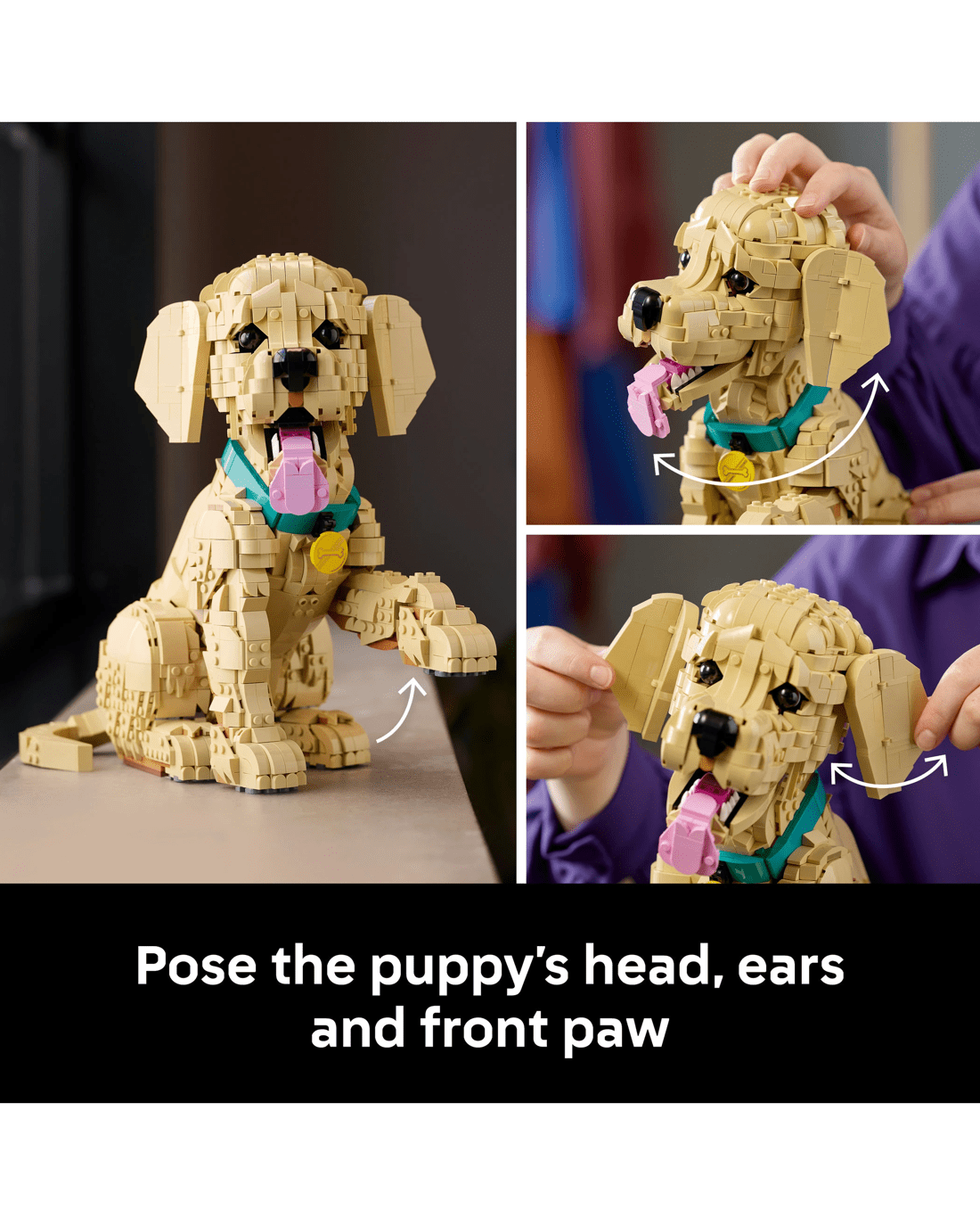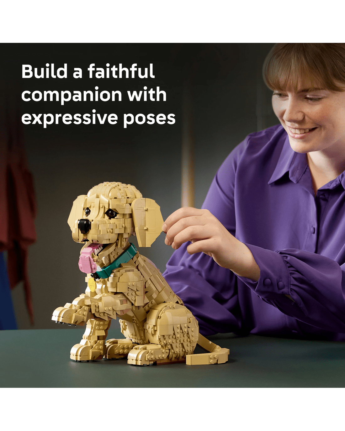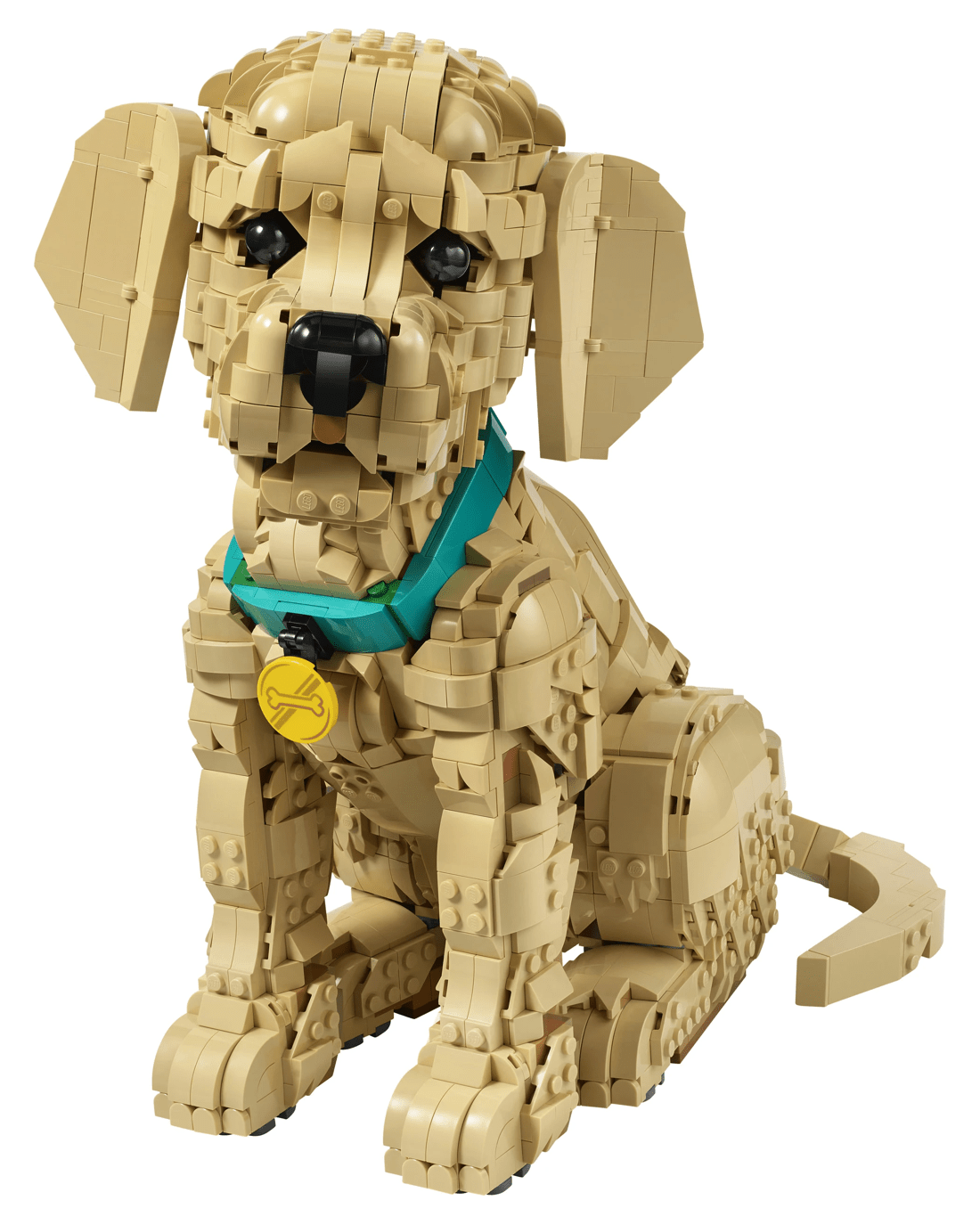 - Posable Figure - Craft a detailed LEGO interpretation of a golden retriever puppy with a colourful collar and medallion and movable limbs for creating dynamic poses