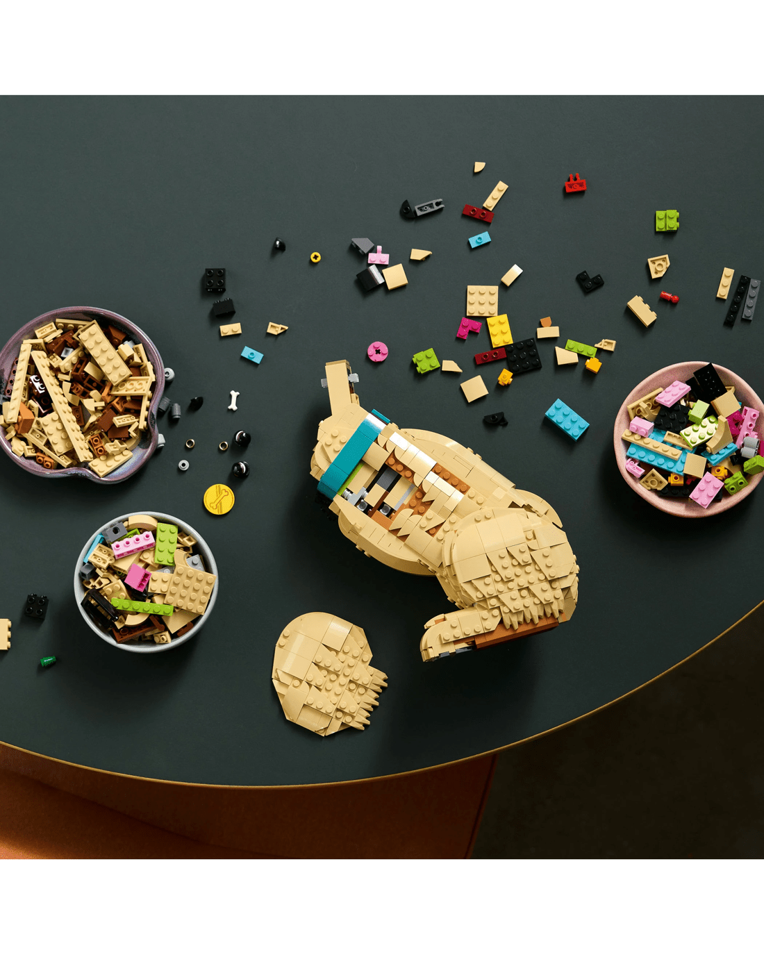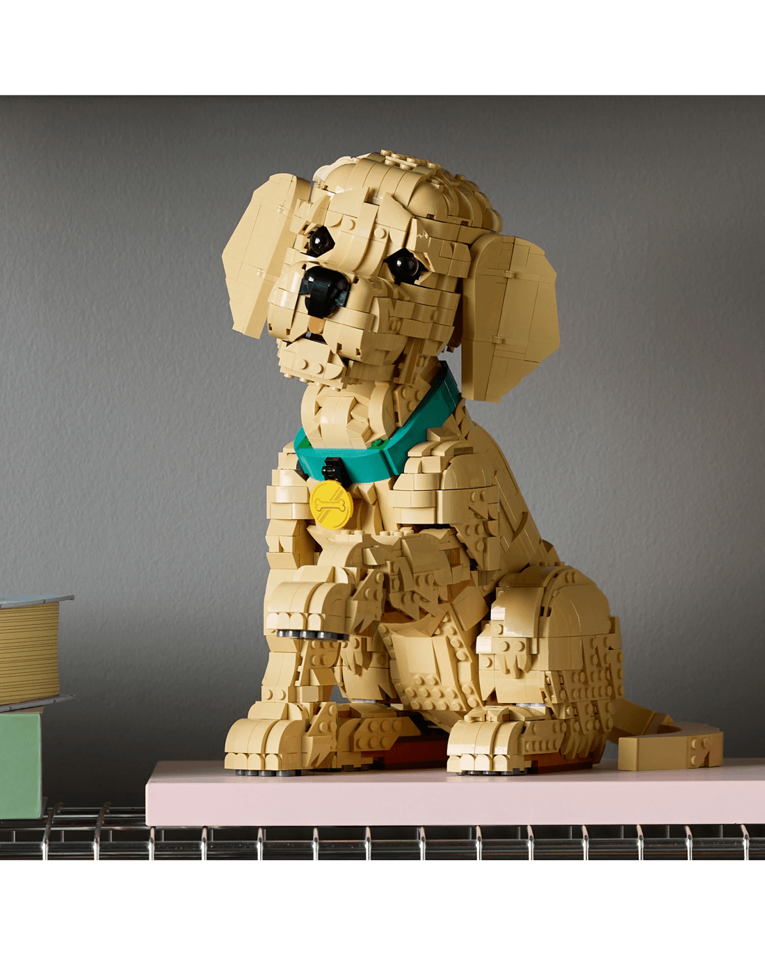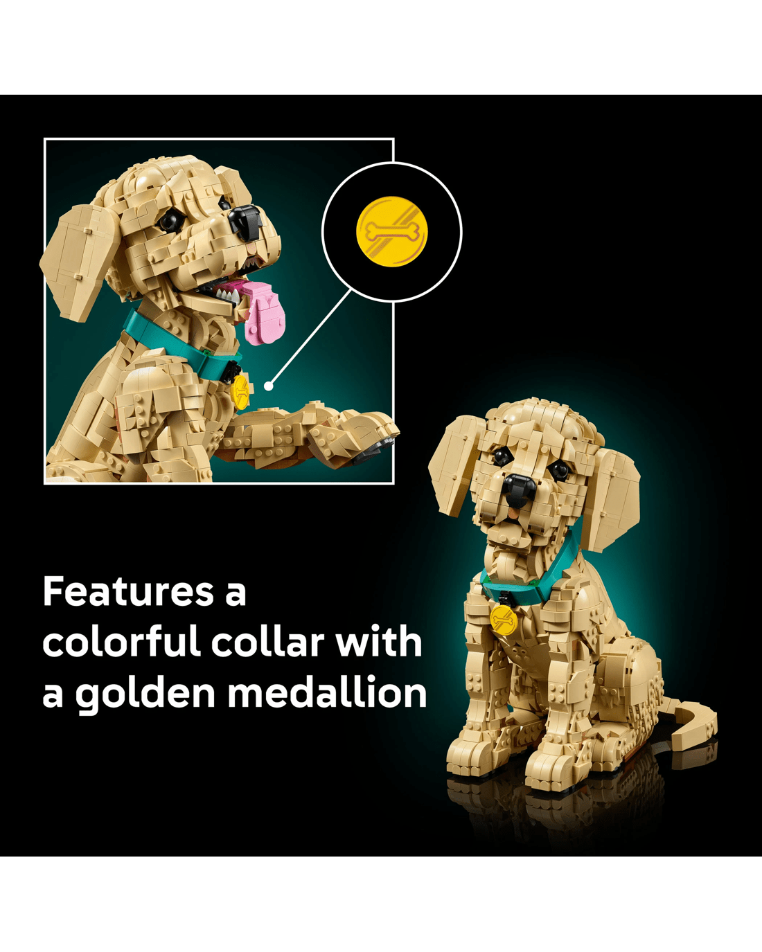 - Posable Figure - Craft a detailed LEGO interpretation of a golden retriever puppy with a colourful collar and medallion and movable limbs for creating dynamic poses