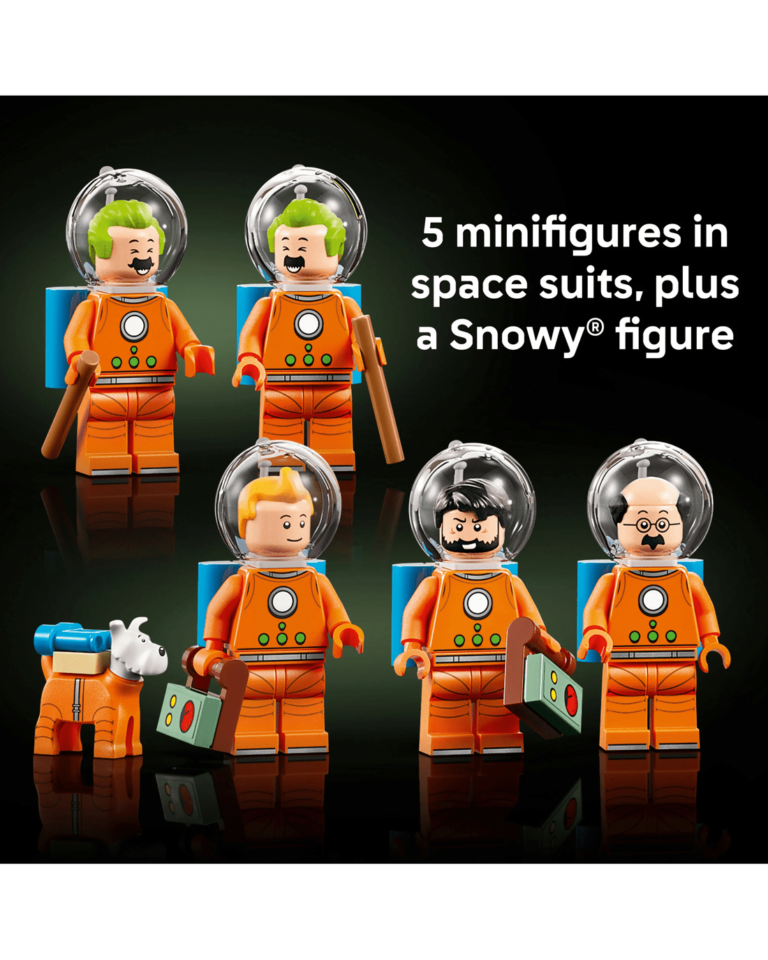 - 6 Tintin Characters - Tintin, Captain Haddock, Thomson and Thompson and Professor Calculus LEGO minifigures, all in space suits with helmet and oxygen tank accessories, plus a Snowy figure