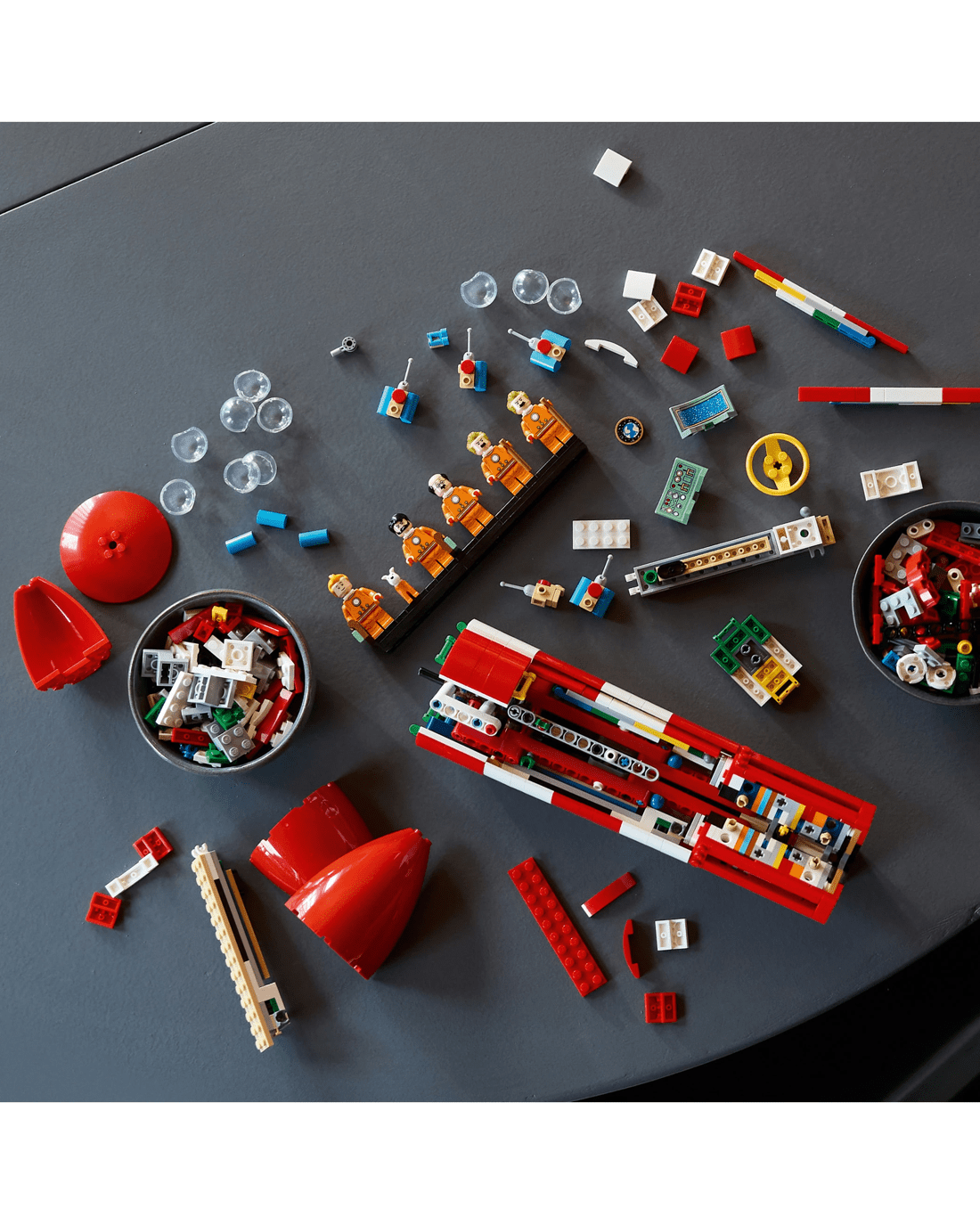 Launch a nostalgic mission to recreate the Tintin Moon Rocket with this collectable LEGO Ideas model building kit for adults. Capture the red and white markings of the rocket ship, as seen in classic comics Destination Moon and Explorers on the Moon. Display with five minifigures, all in space suits with helmets and oxygen tanks (Tintin and Captain Haddock also each have radio accessories), plus a Snowy figure.