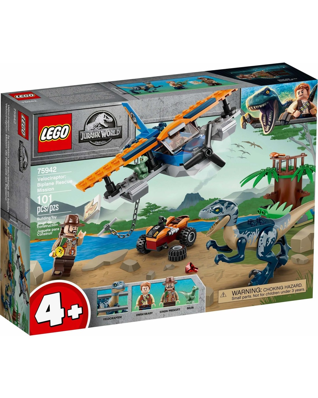 The biplane has a Starter Brick chassis to make building easier and a chain element for rescue missions, and youngsters can role-play exciting stories with 2 Jurassic World minifigures-Owen Grady and Sinjin Prescott.