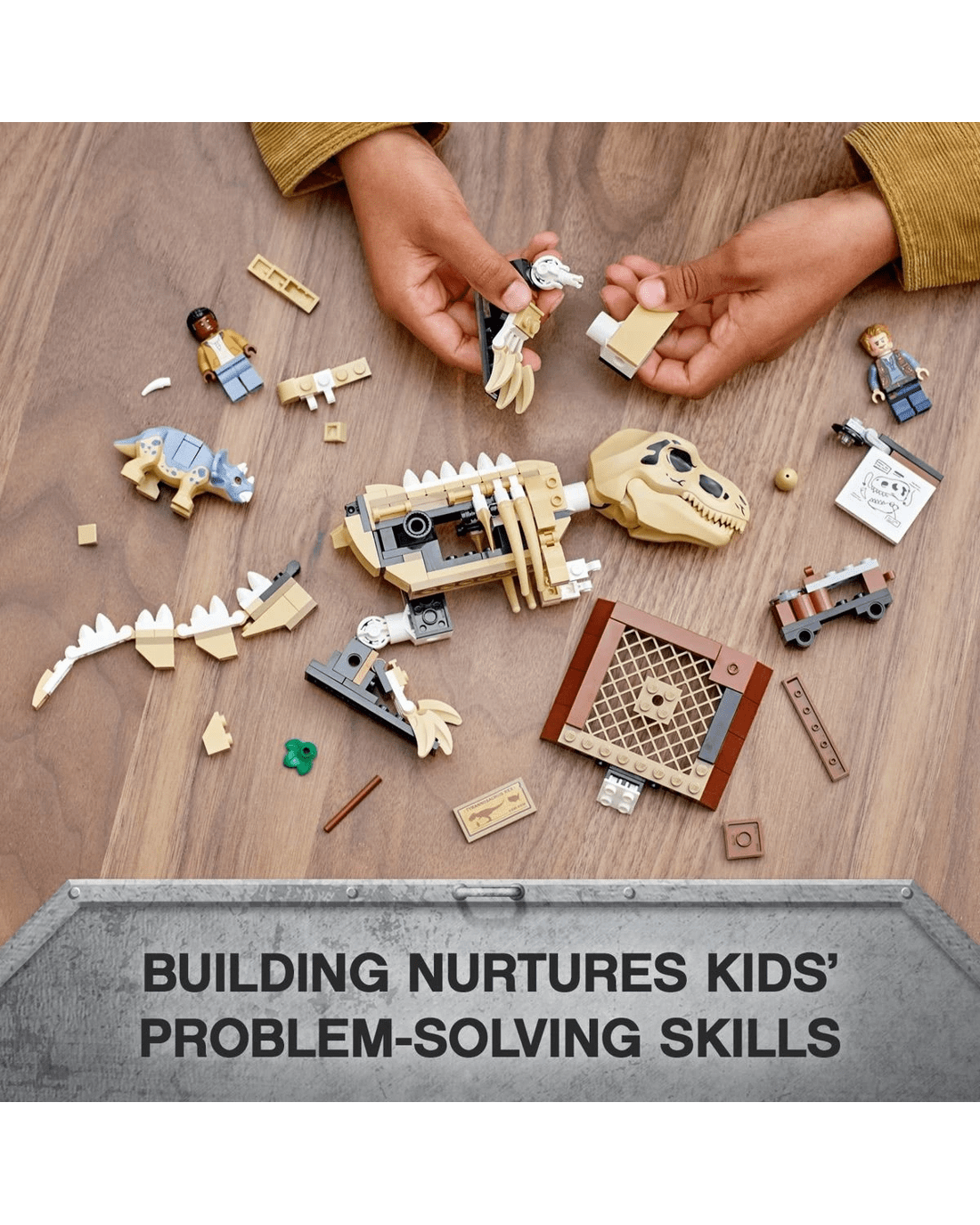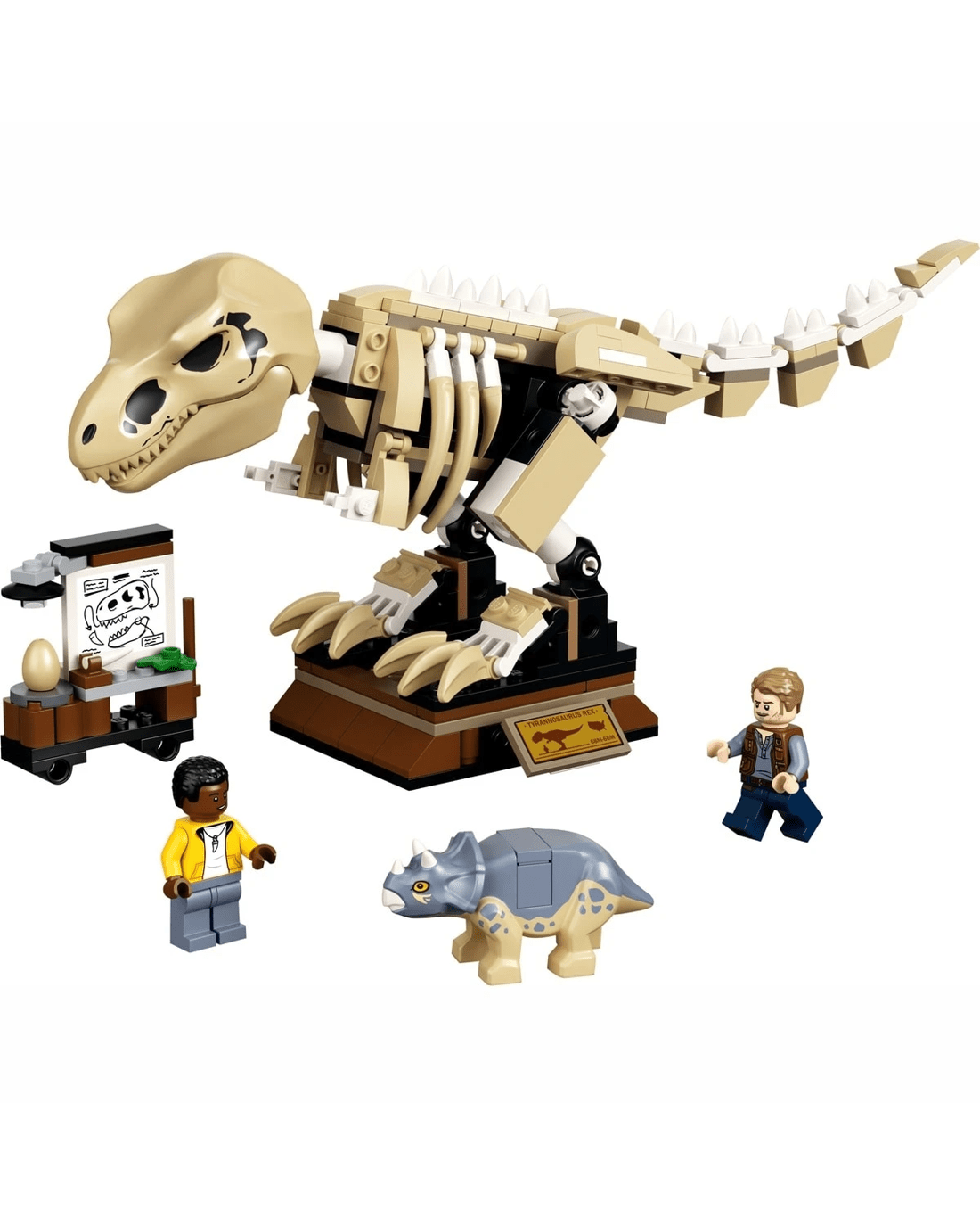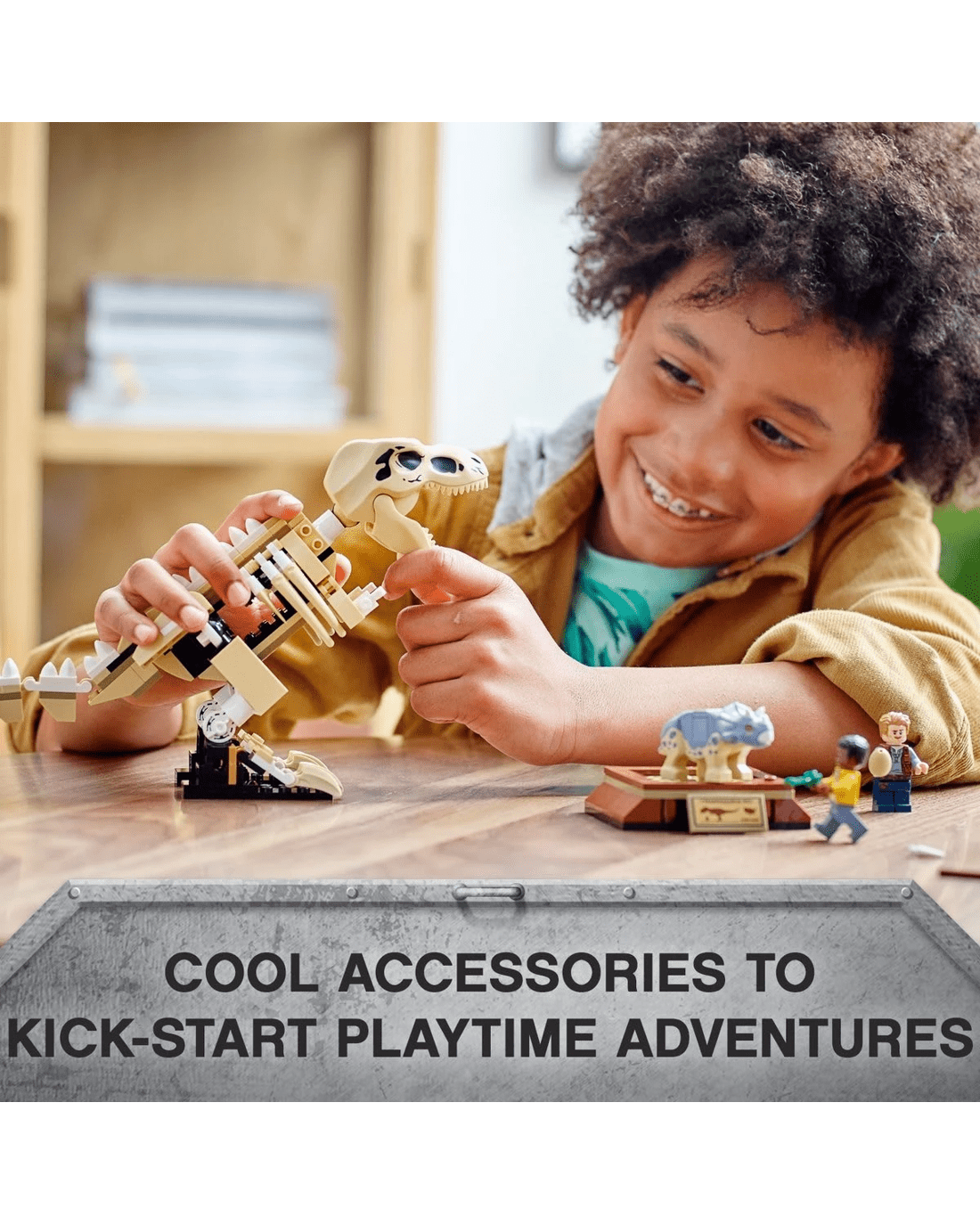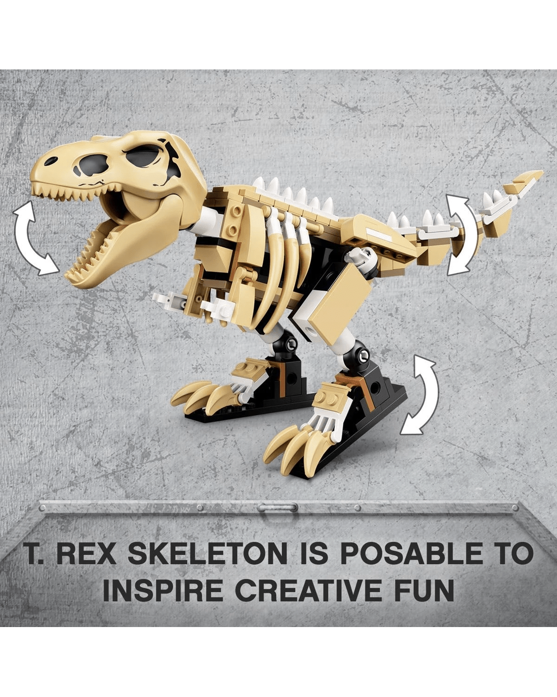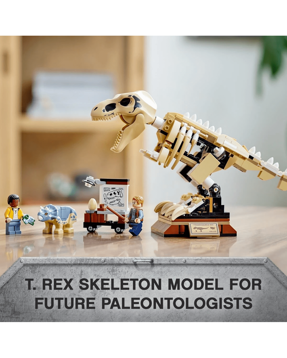 - Kids can build their own T. rex Dinosaur Fossil Exhibition and role-play as paleontologists with this fun-packed LEGO Jurassic World toy playset, featuring a buildable T. rex skeleton model.