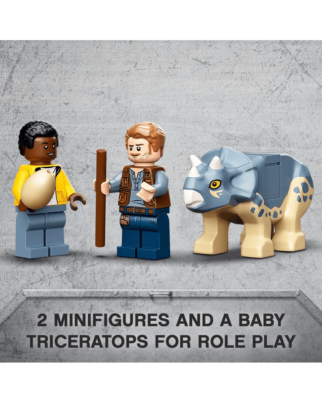 - Includes Darius and Owen Grady minifigures, a baby Triceratops toy figure, a buildable drawing board, plus accessory elements including a pointer stick, dinosaur egg, teeth fossil and a leaf.