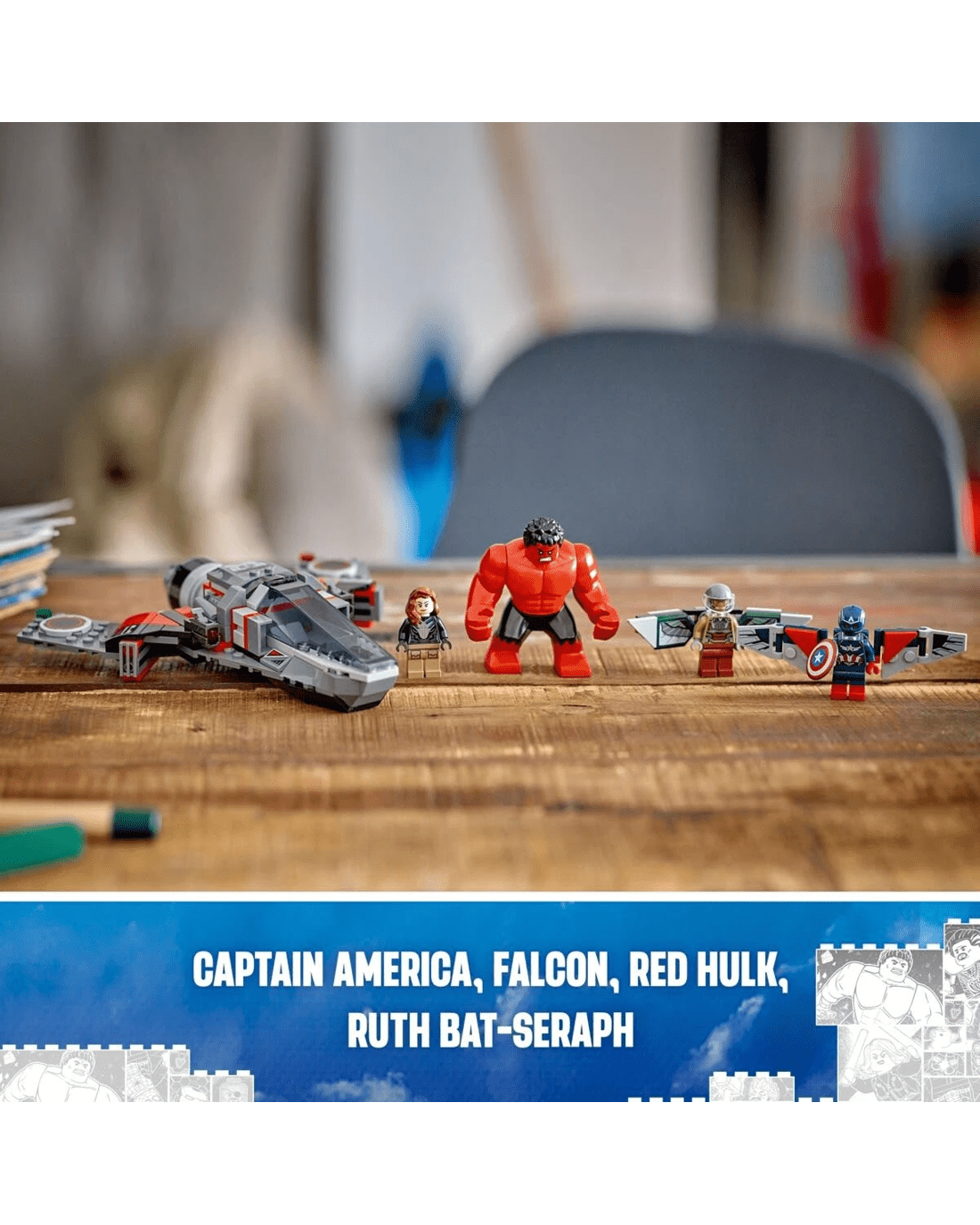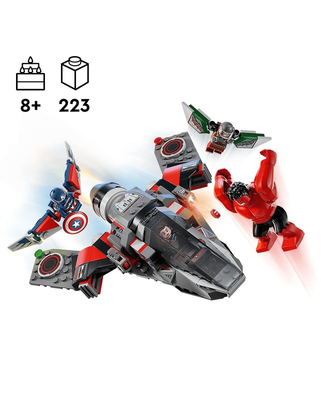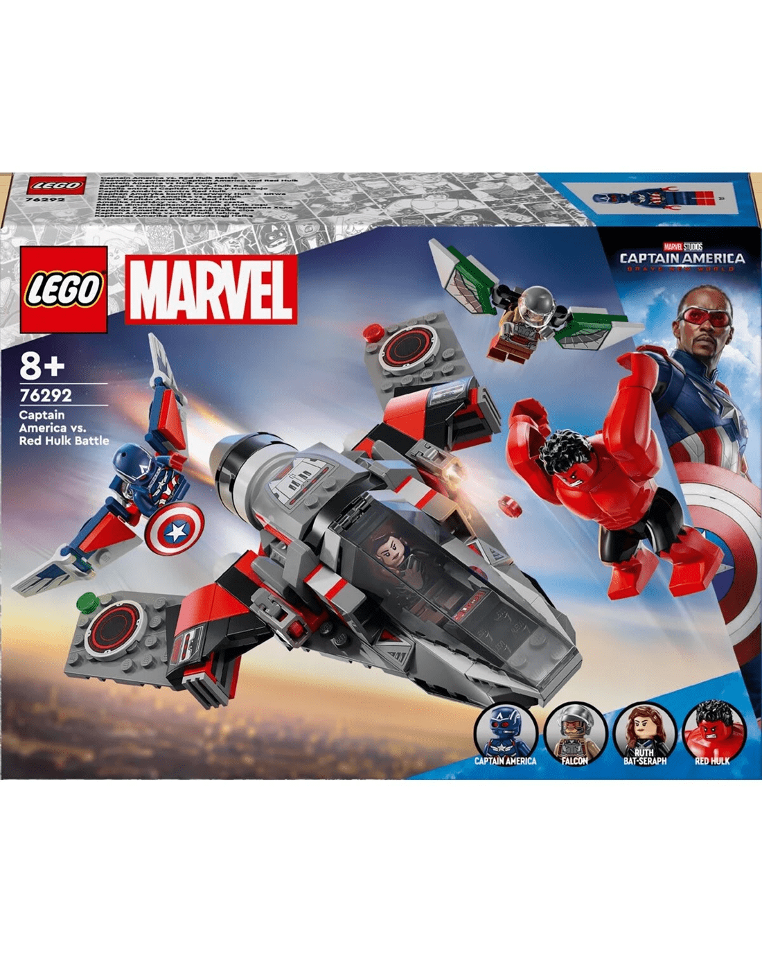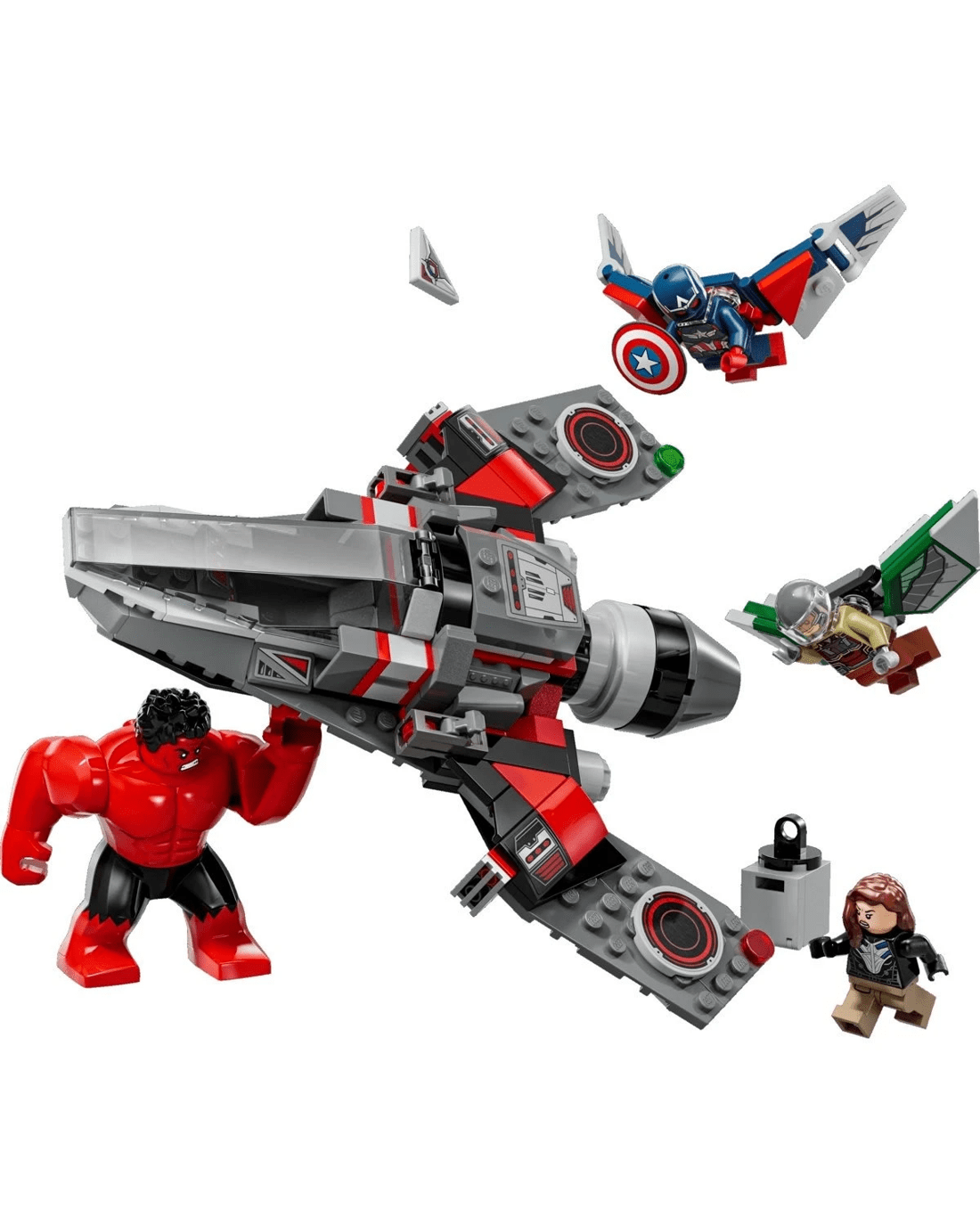 - LEGO Marvel Avengers minifigures - The buildable playset includes 4 minifigures: Captain America and Falcon (both with opening wings), Red Hulk and Ruth Bat-Seraph