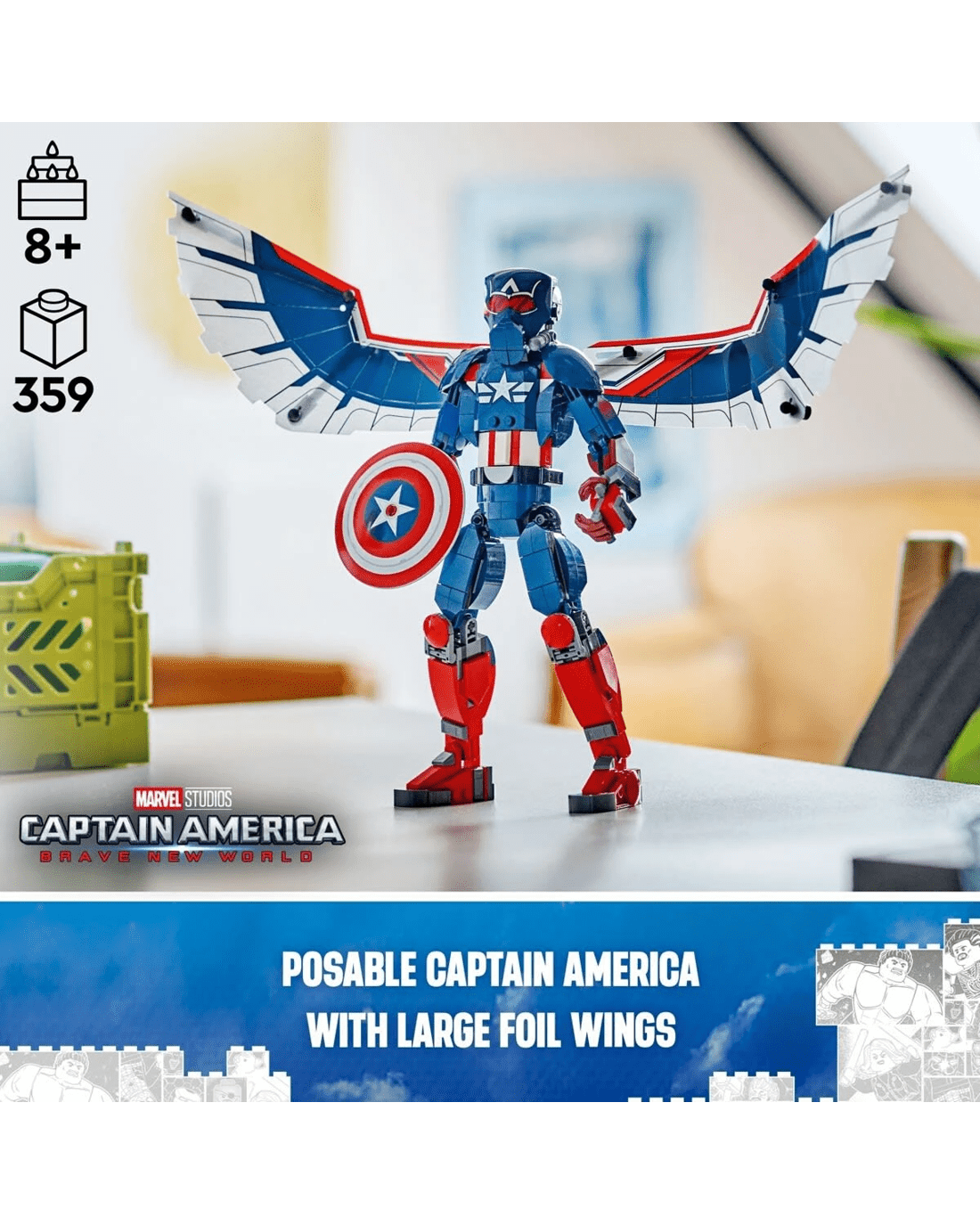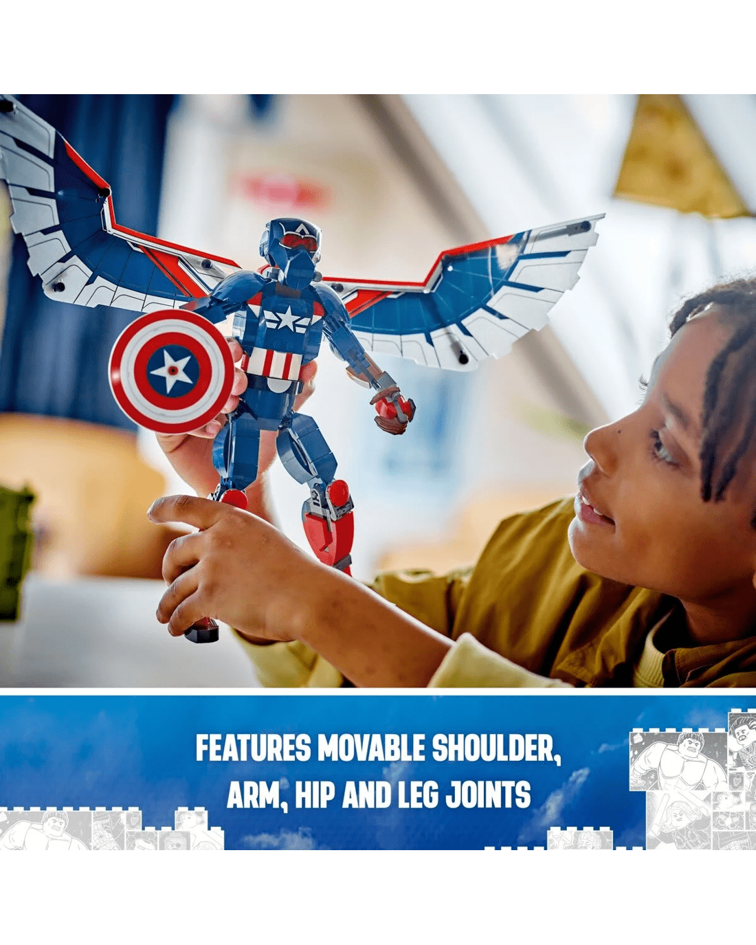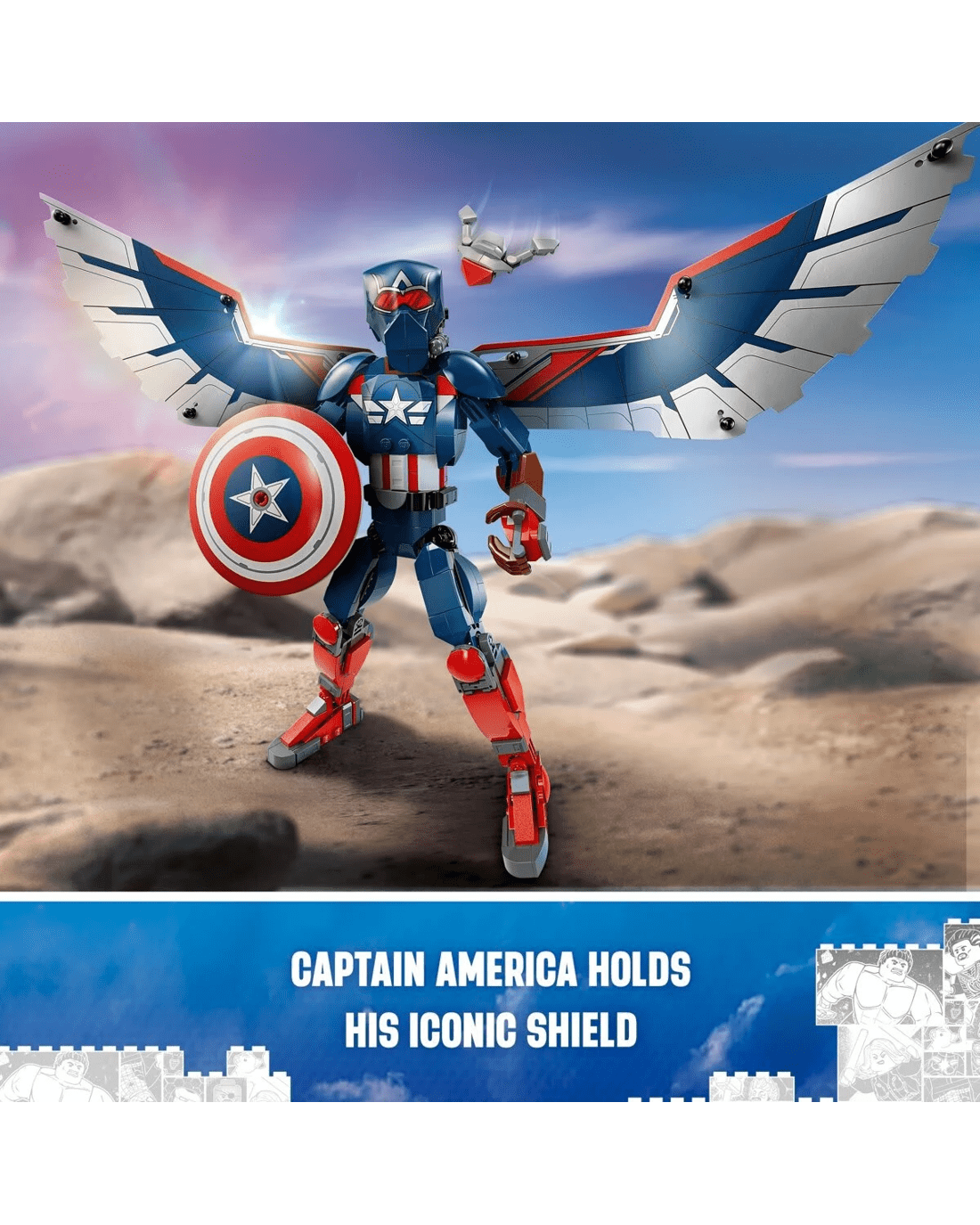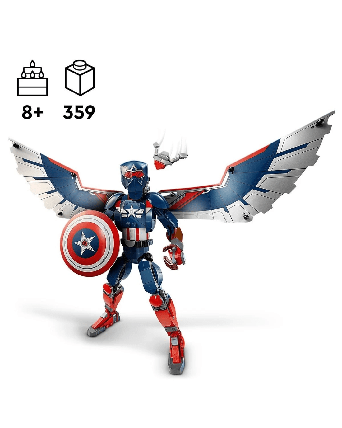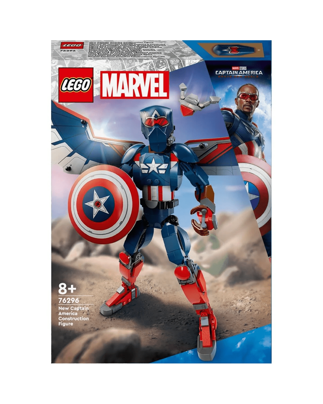 Put Marvel movie action into the hands of young Super Heroes with the authentically detailed, fully jointed LEGO Marvel New Captain America Construction Figure for kids. For this incarnation of the Marvel super soldier, the winged Falcon takes on the role of Captain America, bringing an extra dimension to kids' play experience.