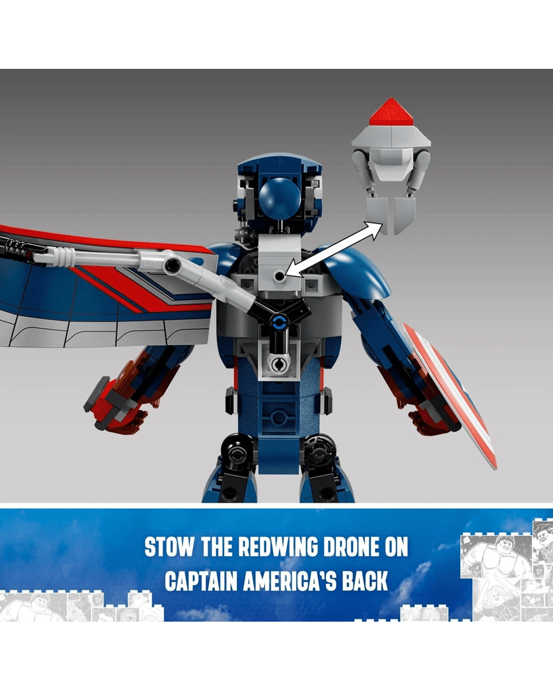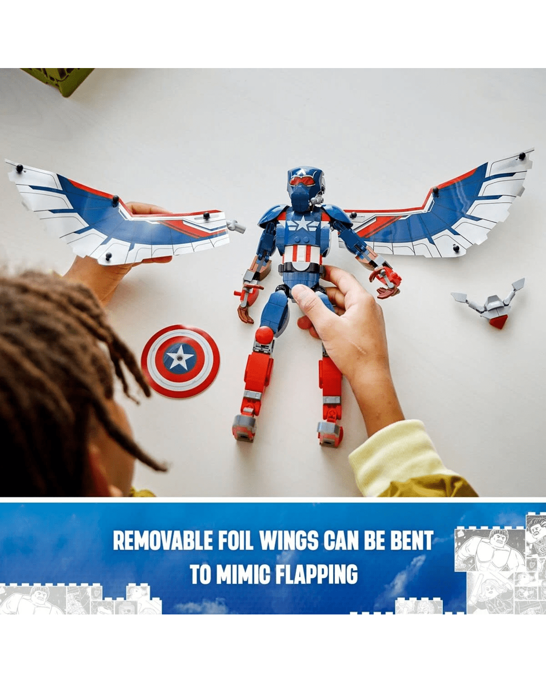The buildable Super Hero toy stands over 28cm tall and has movable shoulder, arm, hip and leg joints, which enable realistic action poses as kids immerse themselves in imaginative role play. Large foil wings are attached to the figure's back. The wings can be bent to mimic flapping and remove easily when the action moves back to the ground. The Captain America figure carries his iconic shield and has a buildable Redwing drone toy fixed to his back, which kids can easily detach for independent play. For added digital fun, builders can zoom in, rotate sets in 3D and track their progress using the fun, intuitive LEGO Builder app.