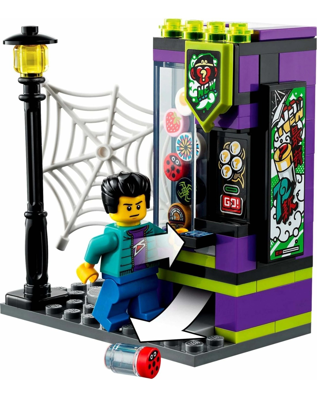 The jet airplane features 2 spring-loaded shooters and 2 stud shooters. There's also a buildable, working vending machine-'scan'' the cell phone element, and drink-can elements are dispensed.