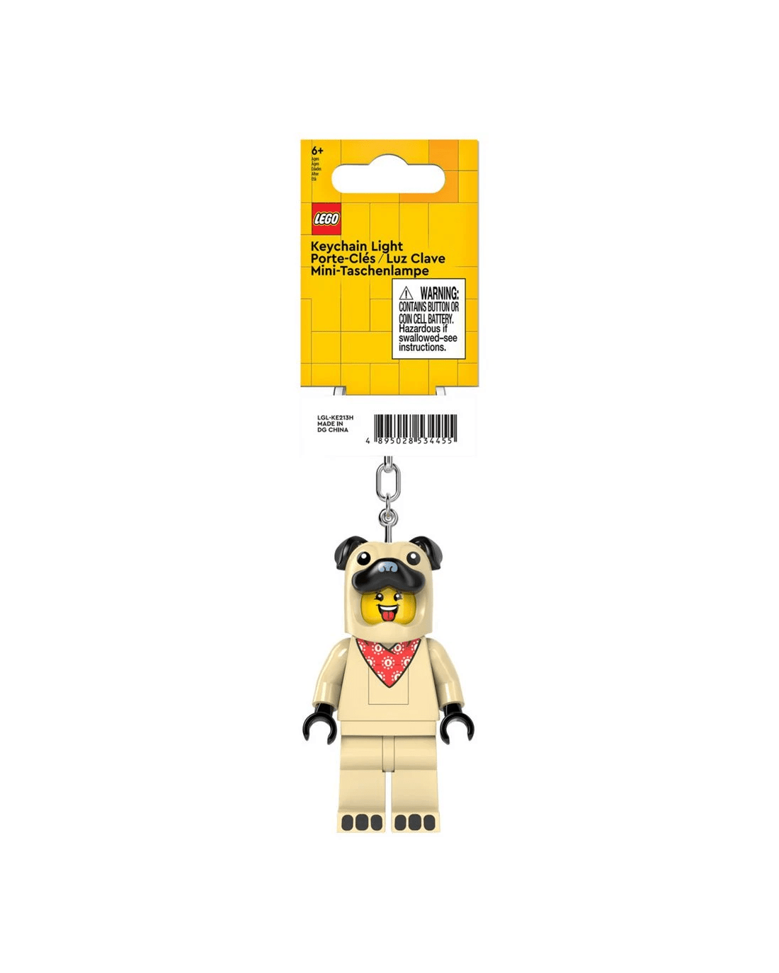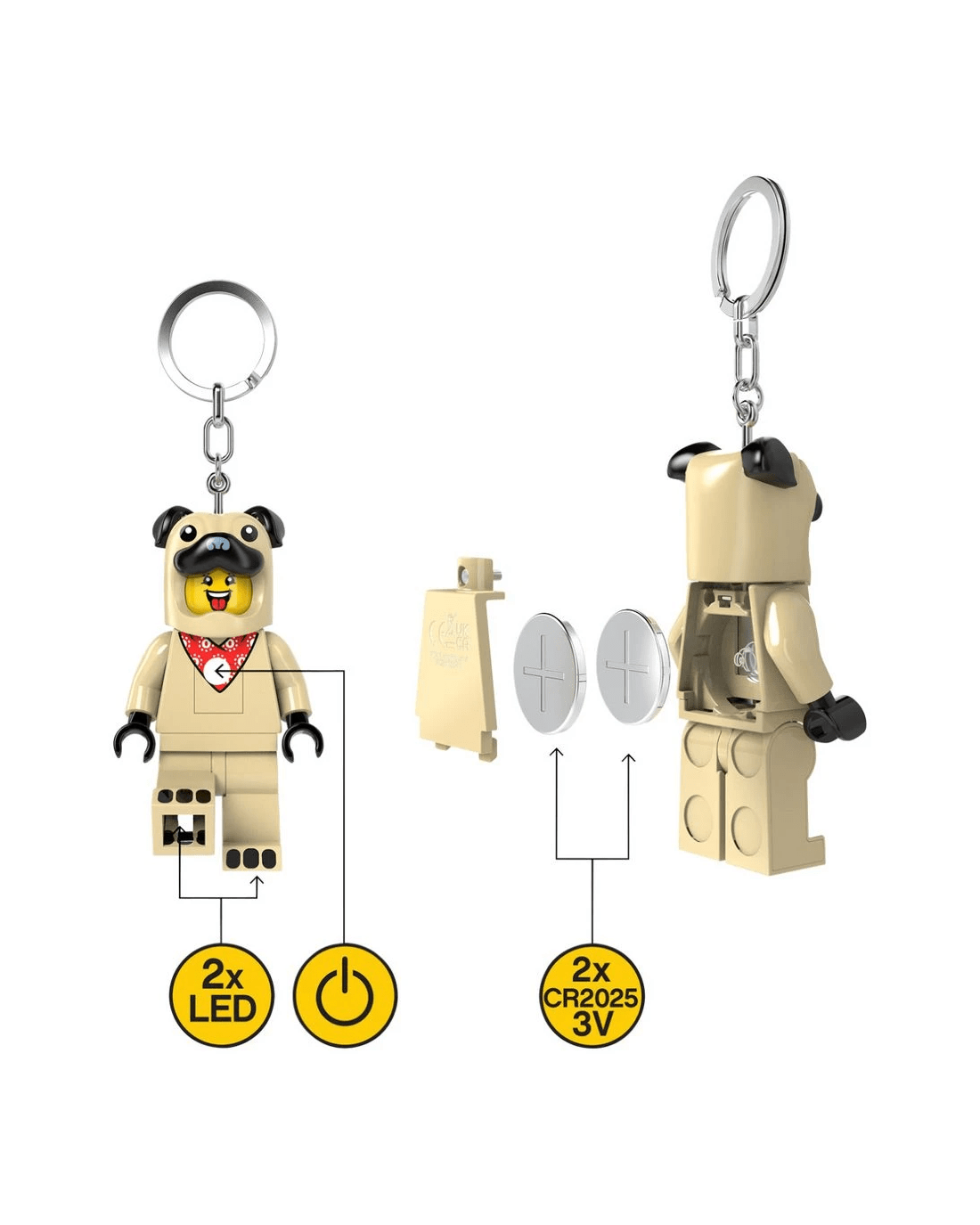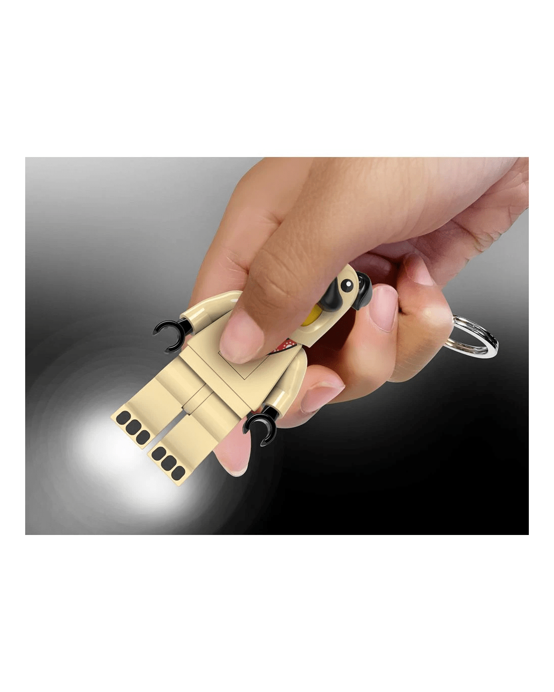 - The keyring features a fun minifigure with moveable arms and legs.