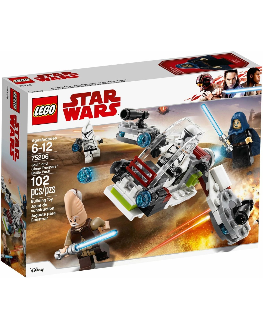 Command your own LEGO(R) Star Wars Jedi & Clone Trooper squad with this fun battle pack, featuring 2 Lightsaber-wielding Jedi warriors, 2 Clone Troopers with stud blasters, and a speeder with stud shooters and rotating wingtip guns.