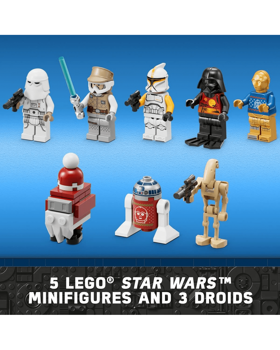 - 8 LEGO Star Wars characters - C-3PO and R2-D2 in festive outfits, Darth Vader in a summer outfit, plus Luke Skywalker, a Clone Trooper Commander, Snowtrooper, Battle Droid and a Gonk Droid.