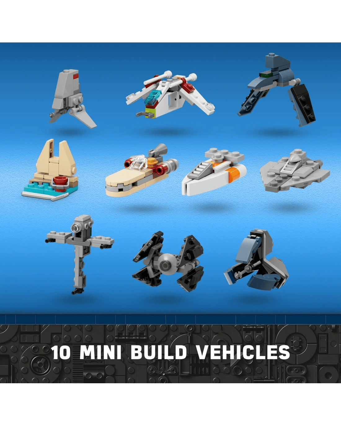 - 10 mini build vehicles - Republic Gunship, Droid Trifighter, ARC-170 Starfighter, Bad Batch Shuttle, Luke's Landspeeder, T-16 Skyhopper, V-35 Landspeeder, B-wing, TIE Interceptor and Hoth AT-ST.