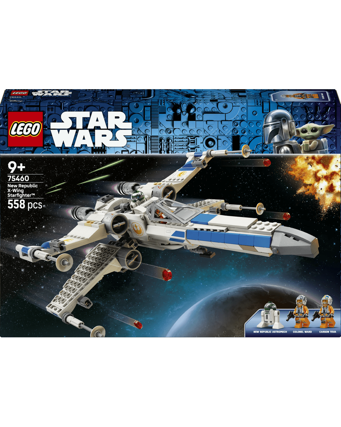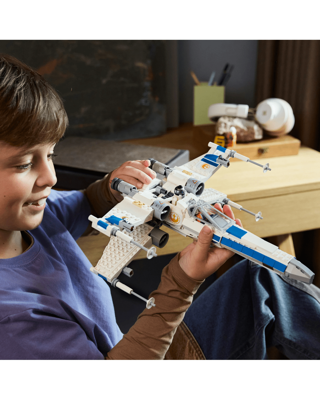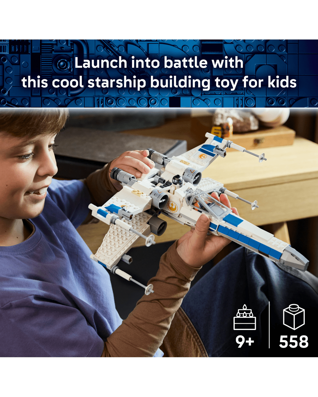 Reimagine an iconic starship for a new era with the LEGO Star Wars New Republic X-Wing Starfighter model building toy for kids. Capture the X-wing’s classic design and striking blue and white colours of the New Republic, as seen in Star Wars: The Mandalorian and Grogu. Stow equipment in the rear compartment and check the engines to prepare for battle. Pilot the starfighter with either the Colonel Ward or Carson Teva LEGO minifigure and place the New Republic Astromech LEGO droid figure behind the cockpit. Retract the landing gear, push the button to flip the wings into attack mode and activate the four stud shooters.