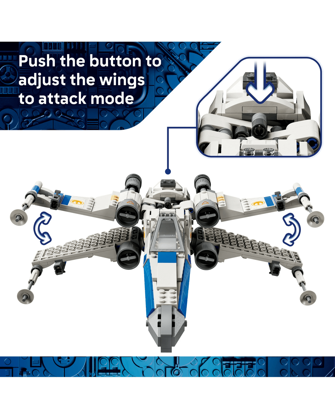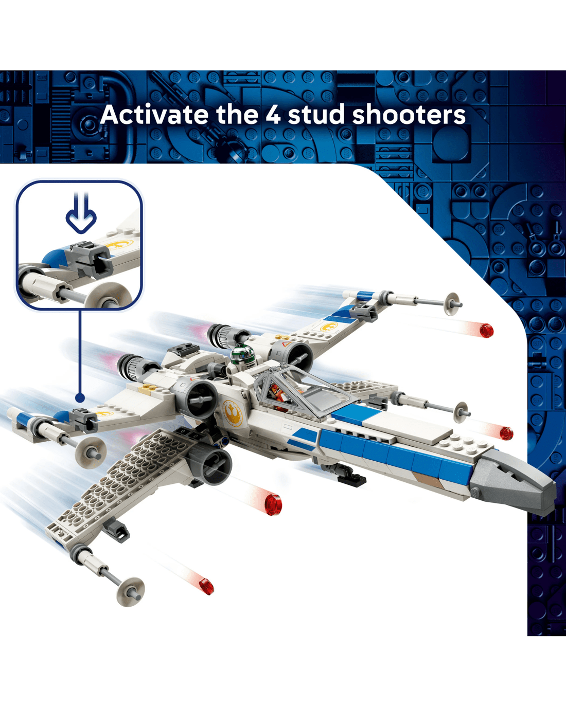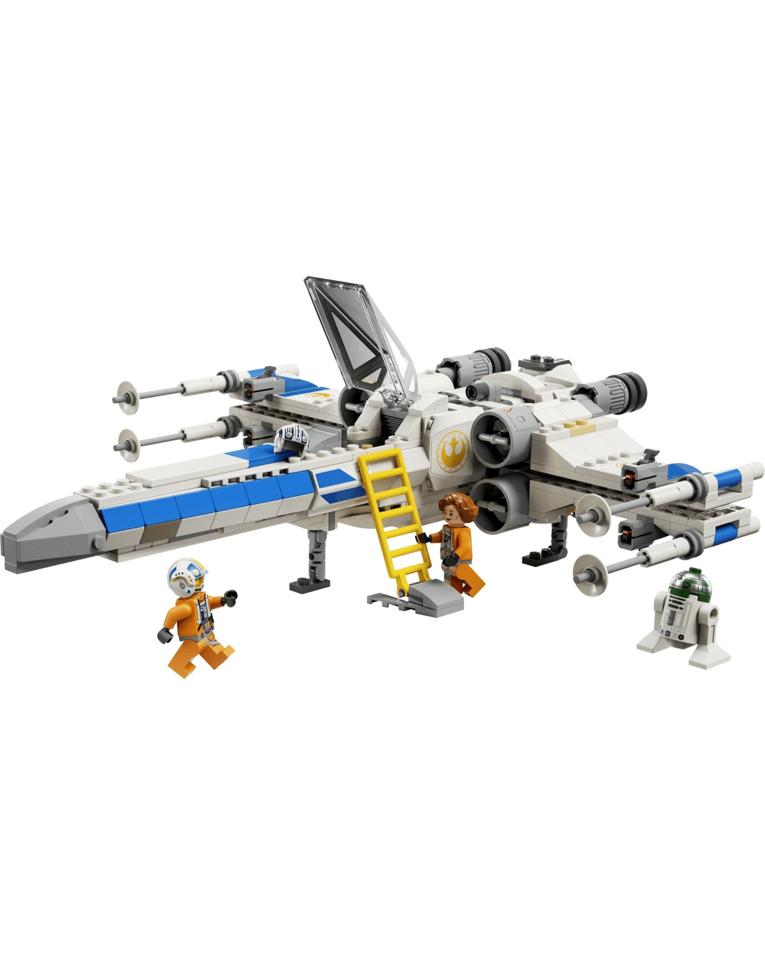 Reimagine an iconic starship for a new era with the LEGO Star Wars New Republic X-Wing Starfighter model building toy for kids. Capture the X-wing’s classic design and striking blue and white colours of the New Republic, as seen in Star Wars: The Mandalorian and Grogu. Stow equipment in the rear compartment and check the engines to prepare for battle. Pilot the starfighter with either the Colonel Ward or Carson Teva LEGO minifigure and place the New Republic Astromech LEGO droid figure behind the cockpit. Retract the landing gear, push the button to flip the wings into attack mode and activate the four stud shooters.