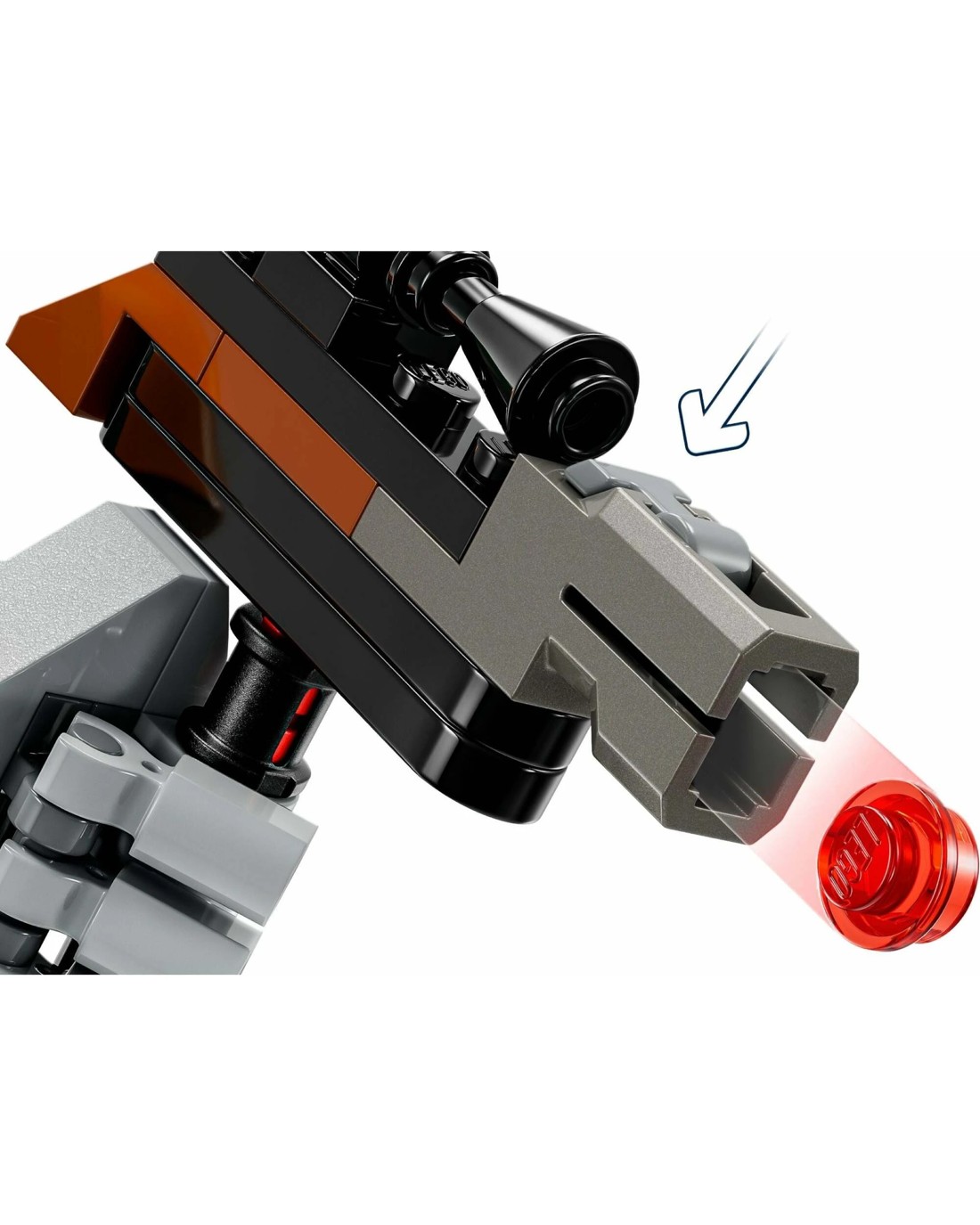A Boba Fett LEGO(R) minifigure: Boba Fett comes with a blaster rifle and jetpack accessory element. The blaster rifle can be clipped to the mech, and Boba can wear the jetpack in the cockpit