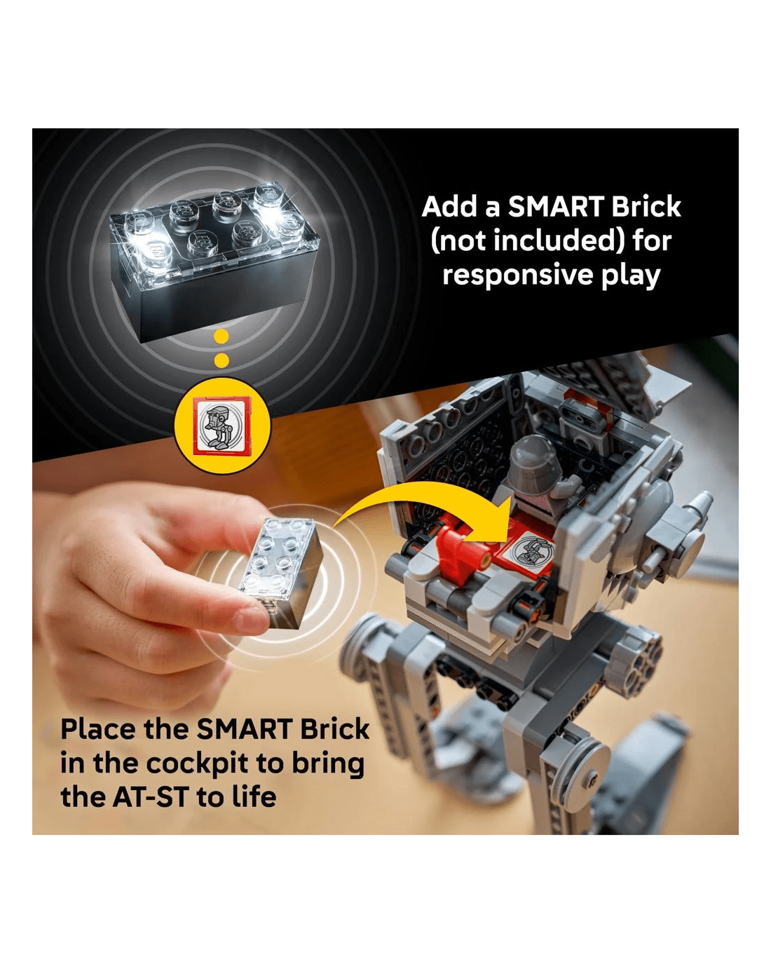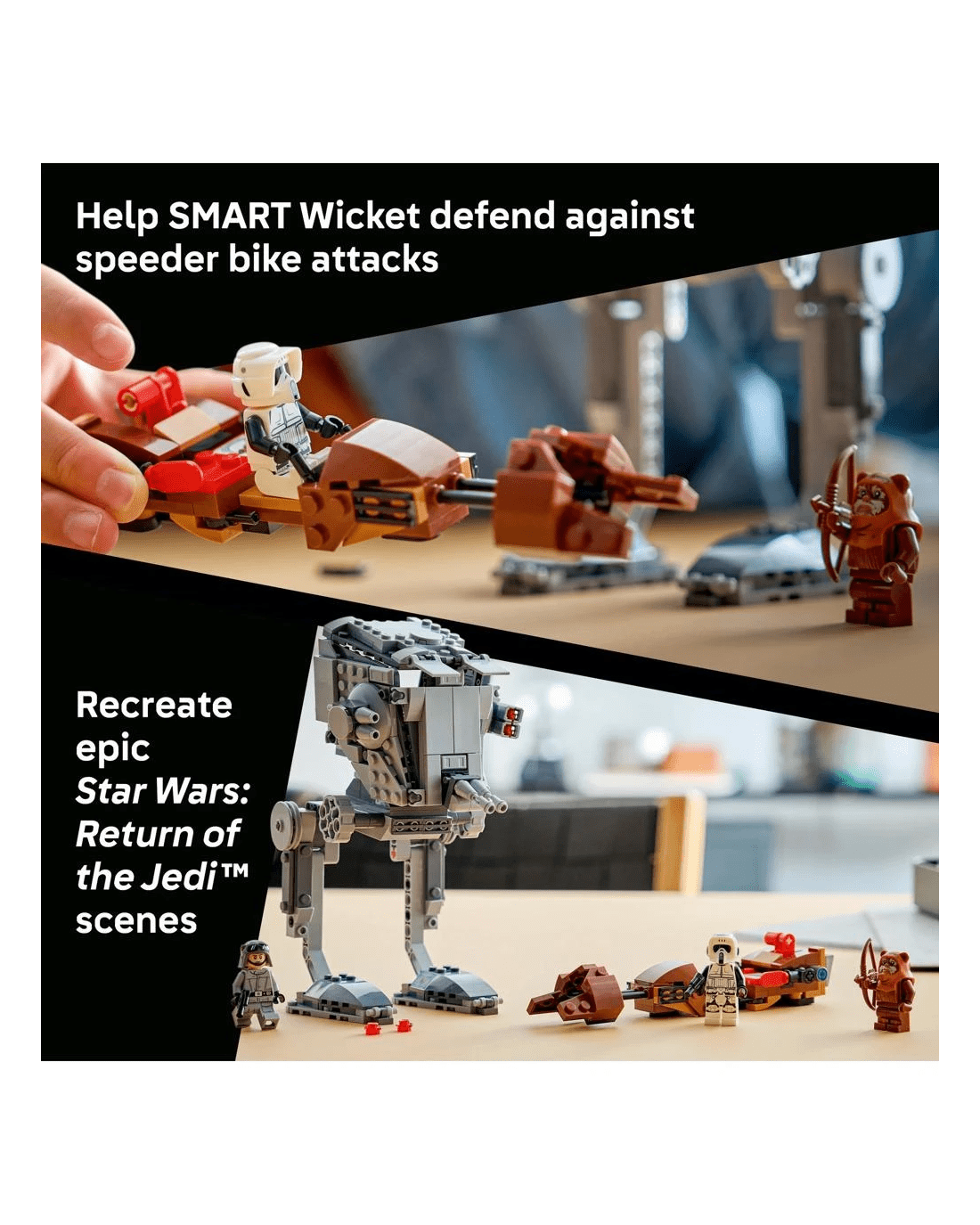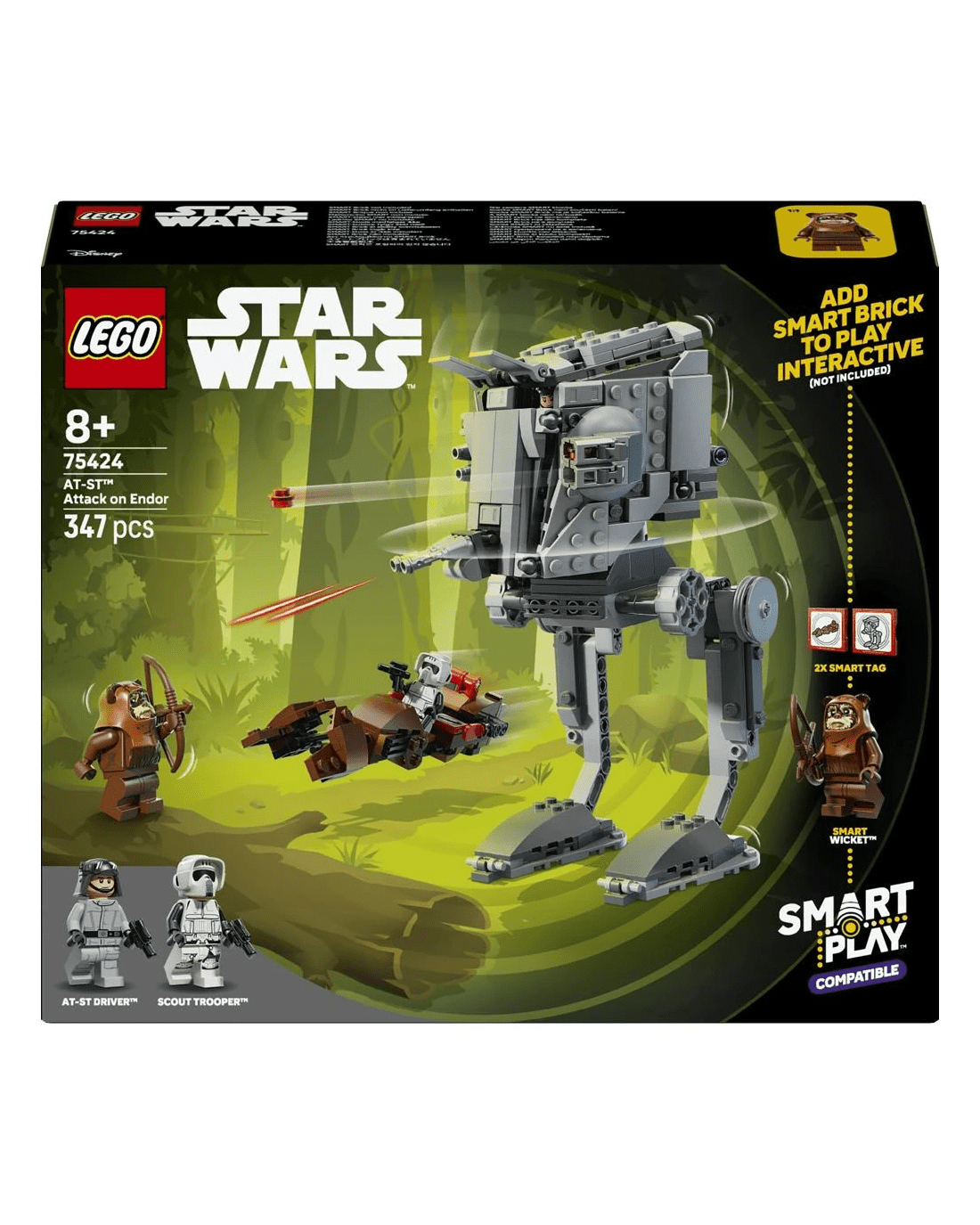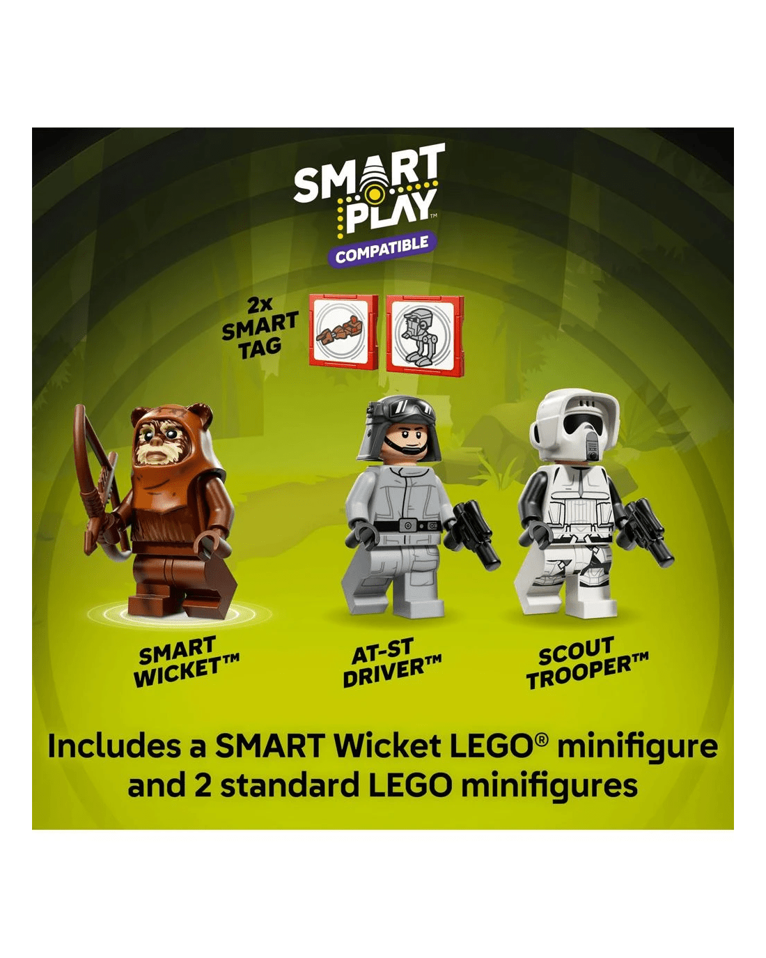 This LEGO SMART Play Compatible Set features a SMART Wicket LEGO minifigure and an AT-ST Driver and Scout Trooper to role-play Star Wars: Return of the Jedi battle scenes, plus two SMART Tags. Add a SMART Brick from All-In-One Sets (sold separately) for interactive play with motion-activated, dynamic sounds and lights, including AT-ST and speeder bike engine noises, AT-ST walking sounds and laser-shooting battles.