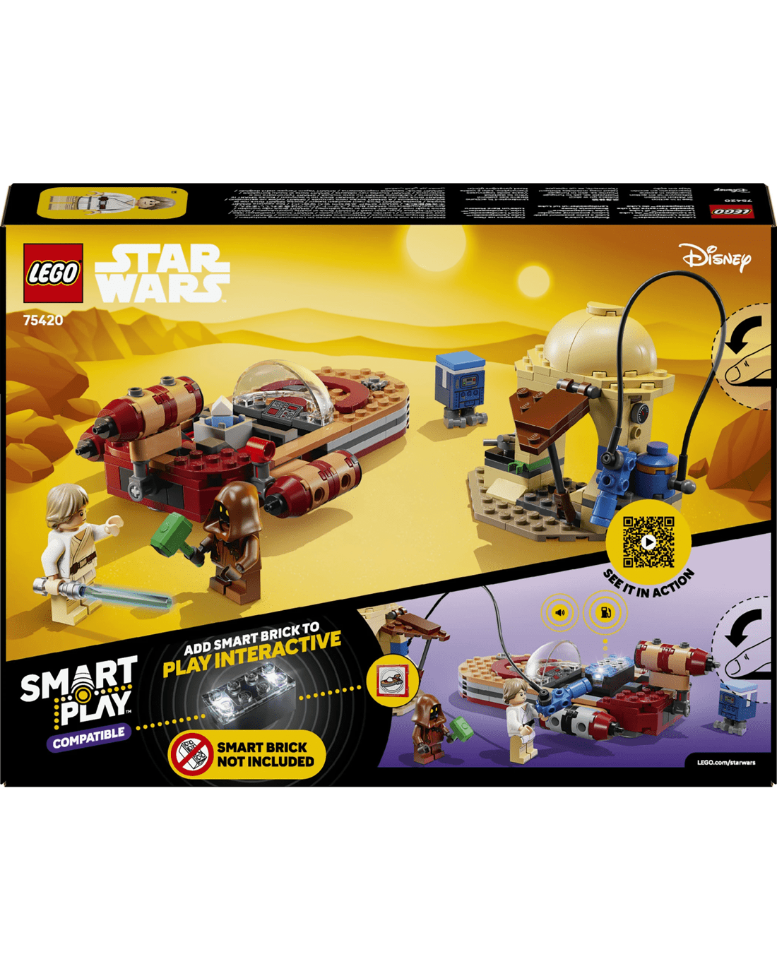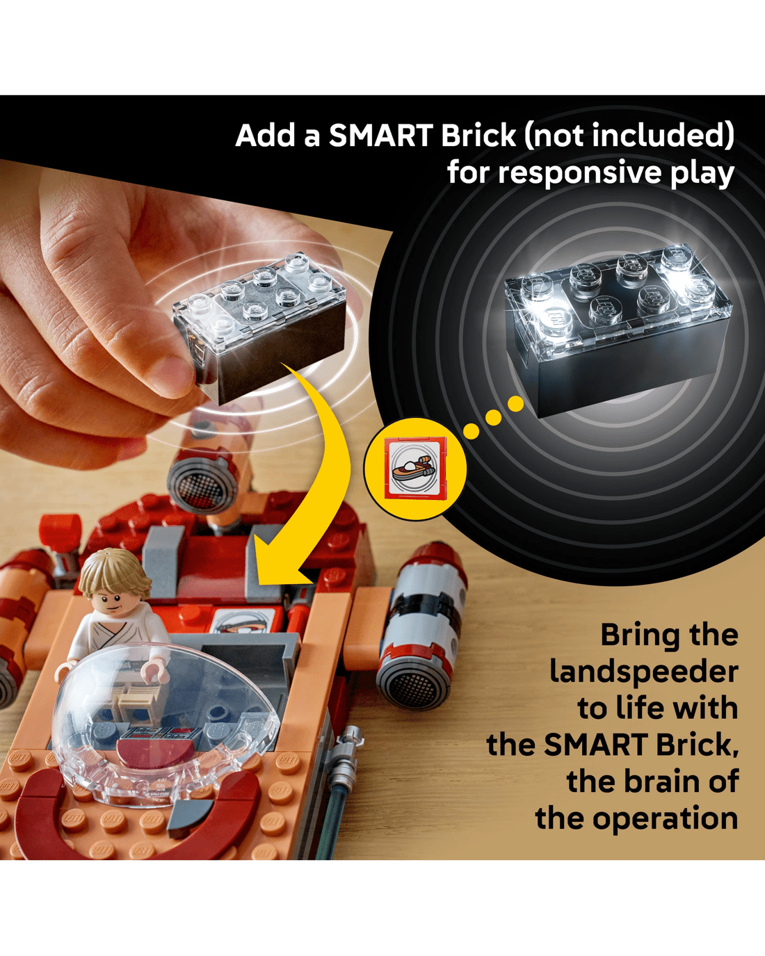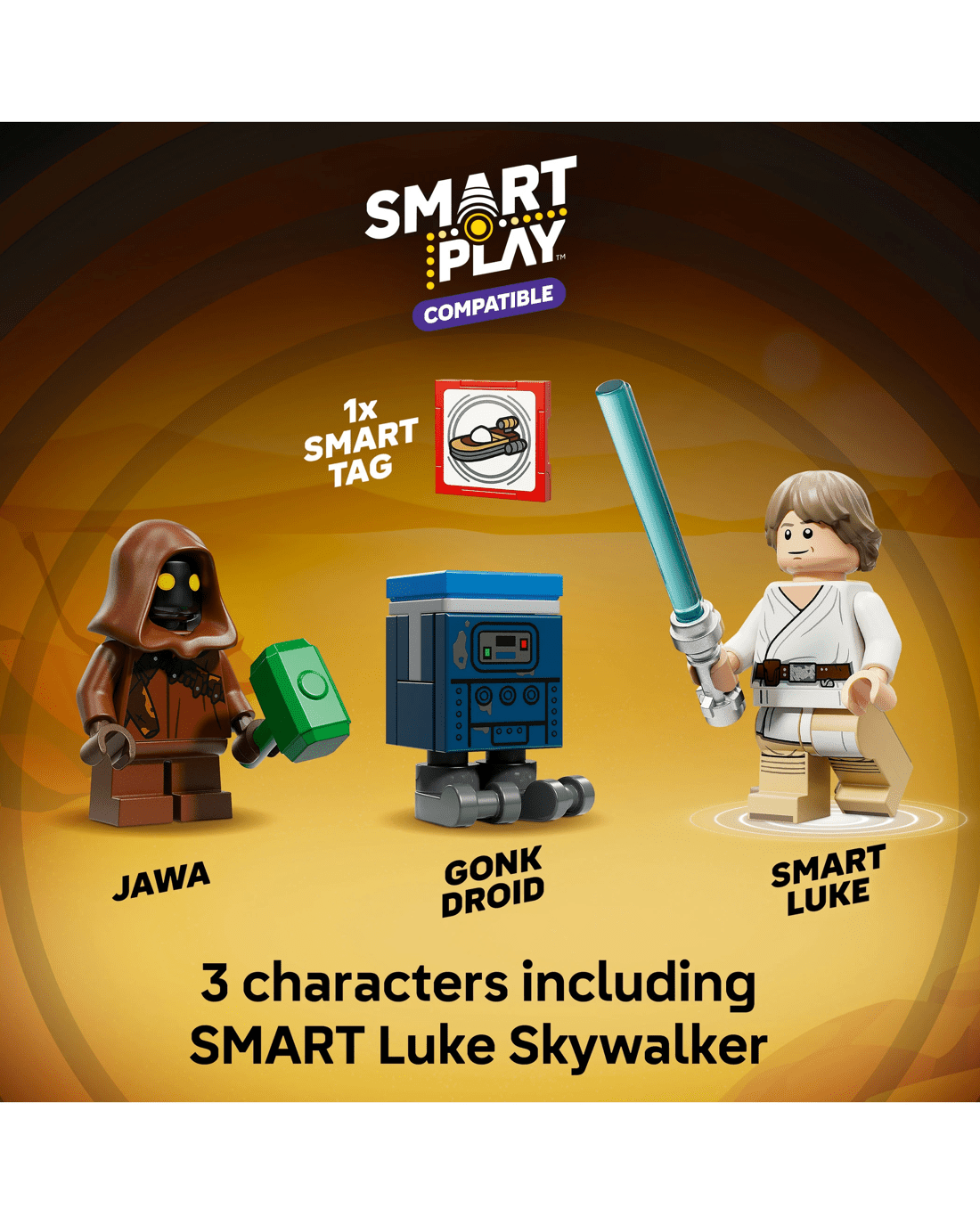 This LEGO SMART Play Compatible Set includes a SMART Luke Skywalker LEGO minifigure, a Jawa LEGO minifigure and a Gonk Droid, plus a SMART Tag. Add a SMART Brick from All-In-One Sets (sold separately) for interactive play, bringing SMART Luke Skywalker to life and activating dynamic lights and sounds when fuelling, repairing and driving the landspeeder.