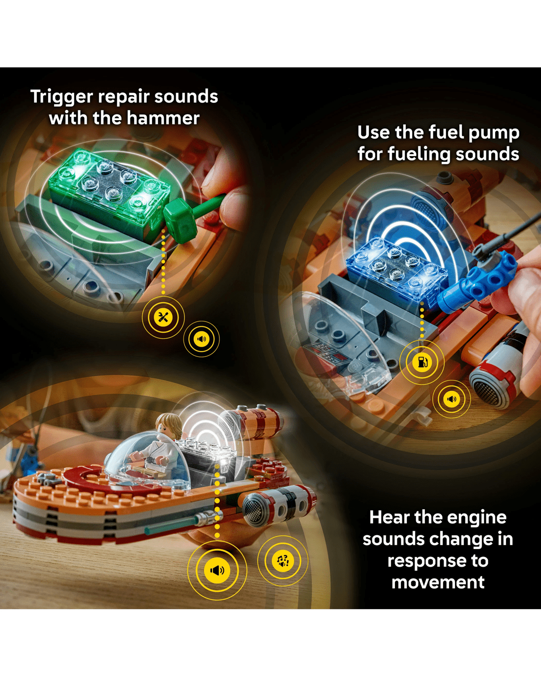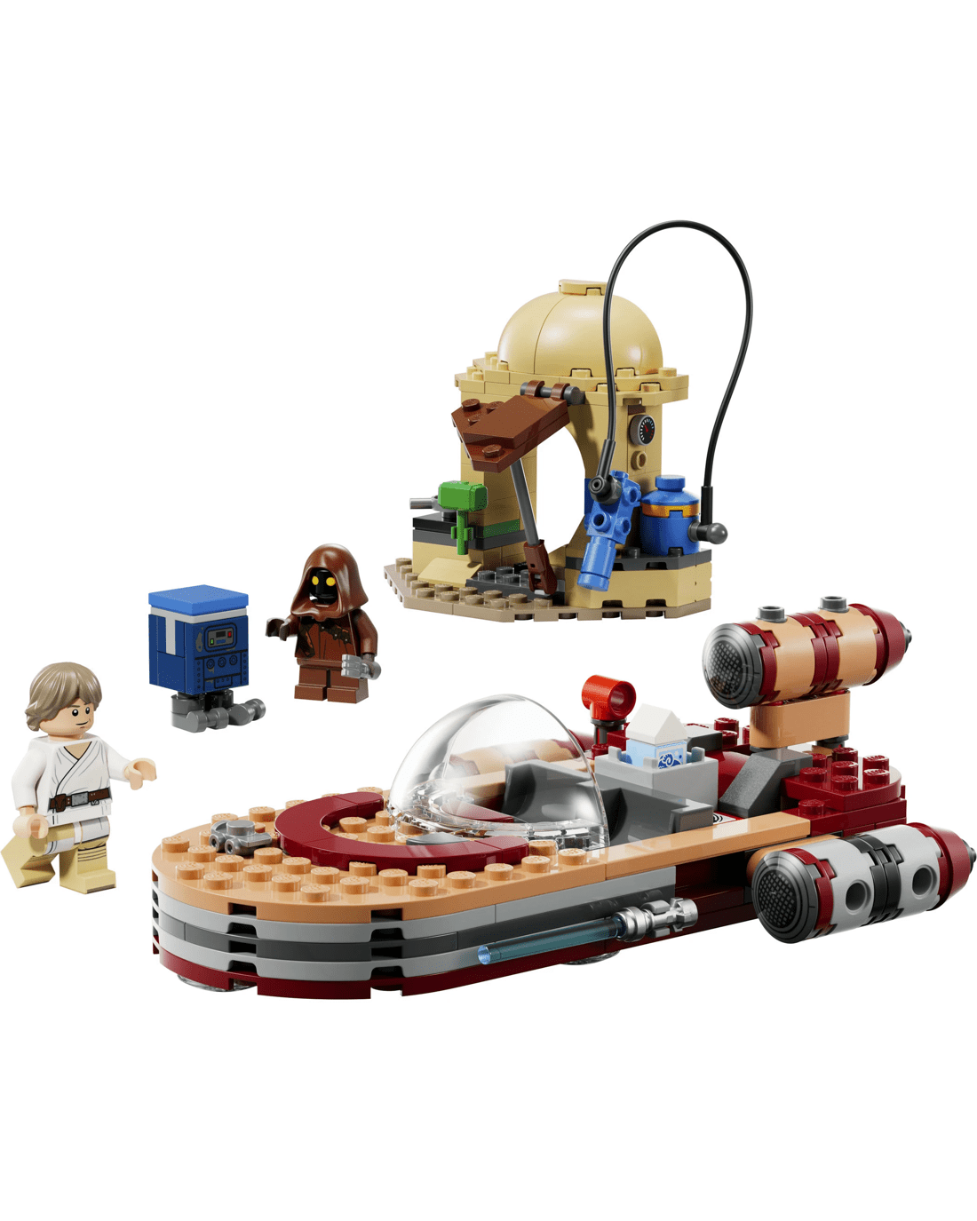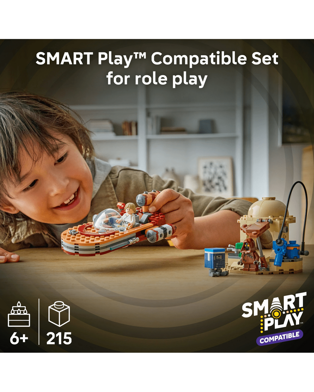 This LEGO SMART Play Compatible Set includes a SMART Luke Skywalker LEGO minifigure, a Jawa LEGO minifigure and a Gonk Droid, plus a SMART Tag. Add a SMART Brick from All-In-One Sets (sold separately) for interactive play, bringing SMART Luke Skywalker to life and activating dynamic lights and sounds when fuelling, repairing and driving the landspeeder.