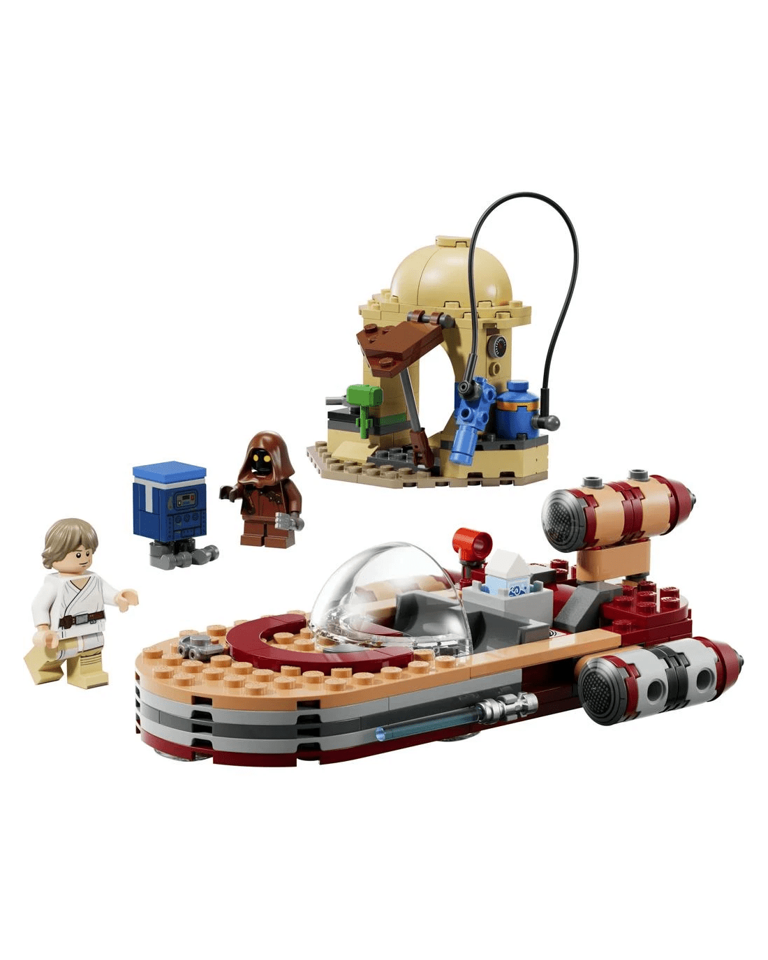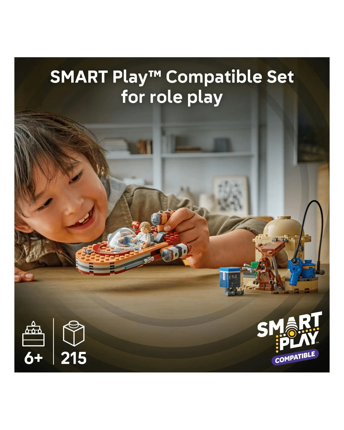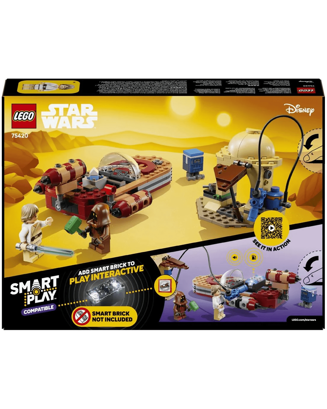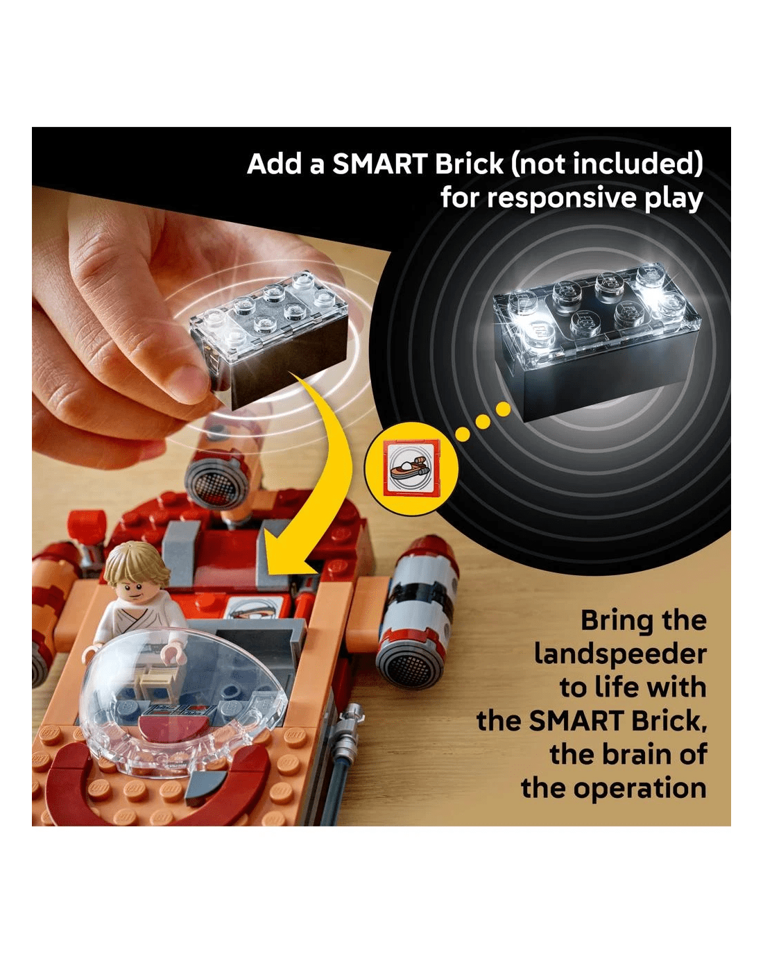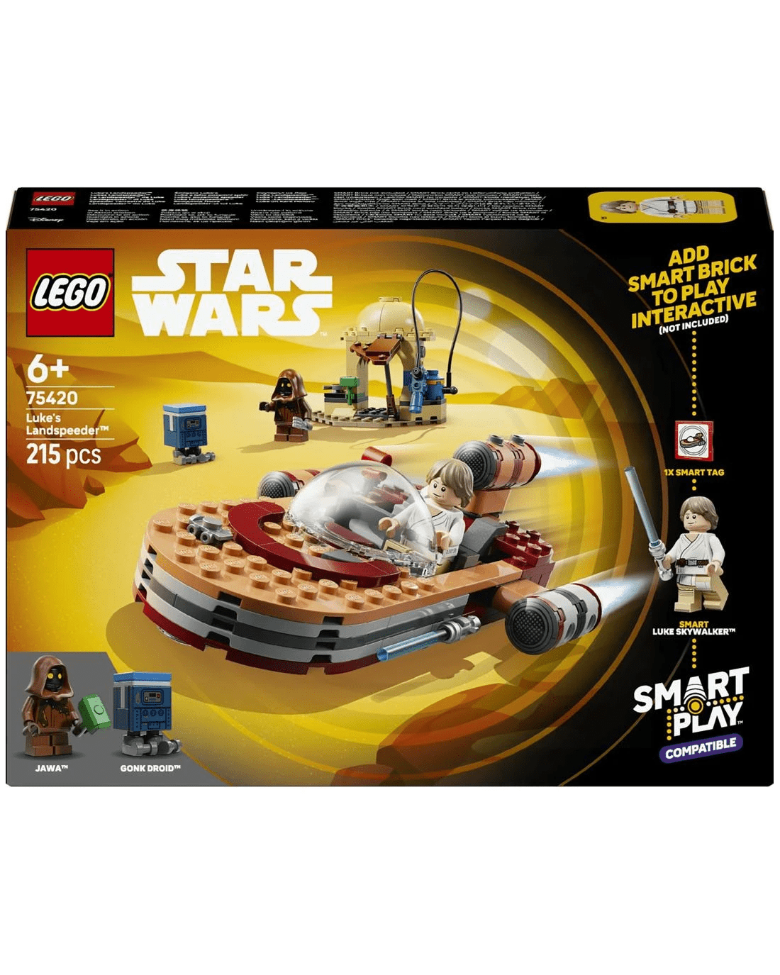 This LEGO SMART Play Compatible Set includes a SMART Luke Skywalker LEGO minifigure, a Jawa LEGO minifigure and a Gonk Droid, plus a SMART Tag. Add a SMART Brick from All-In-One Sets (sold separately) for interactive play, bringing SMART Luke Skywalker to life and activating dynamic lights and sounds when fuelling, repairing and driving the landspeeder.
